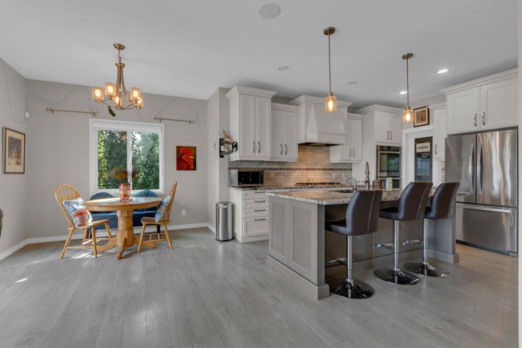 This stunning 4-bedroom bungalow built by McKee Homes showcases quality craftsmanship and thoughtful design, offering over 2,400 sq. ft. of beautifully finished living space backing onto the pond with serene views, walking paths, and easy access to schools and playgrounds. Perfect Family Or Retirement Home. The charming covered front porch welcomes you inside, where you’ll be greeted with 9’ ceilings, engineered hardwood floors, and an abundance of natural light. The open-concept main level features a chef-inspired kitchen with granite counters, stainless steel appliances including a gas stove & double oven, a large island, and a walk-in pantry—perfect for family gatherings. The main floor also hosts a spacious master retreat with a 5-piece ensuite (jet tub, oversized shower, dual sinks, walk-through closet), a second bedroom, and convenient main floor laundry. Downstairs, you’ll find a bright and inviting family room with a gas fireplace, a wet bar, two oversized bedrooms, a full bathroom, and extra comfort with electric baseboard heating. Plenty of storage is available throughout. Step outside and enjoy the fully landscaped, fenced backyard with a deck, patio, two sheds, and lush perennial gardens that bloom beautifully through the seasons—an outdoor oasis overlooking the pond. Additional highlights include R50 attic insulation, triple-pane windows, HRV system, and 50-gallon HWT. Built by McKee Homes, known for their exceptional quality and attention to detail. Don’t miss the opportunity to make this beautiful home yours—schedule your private showing today!
