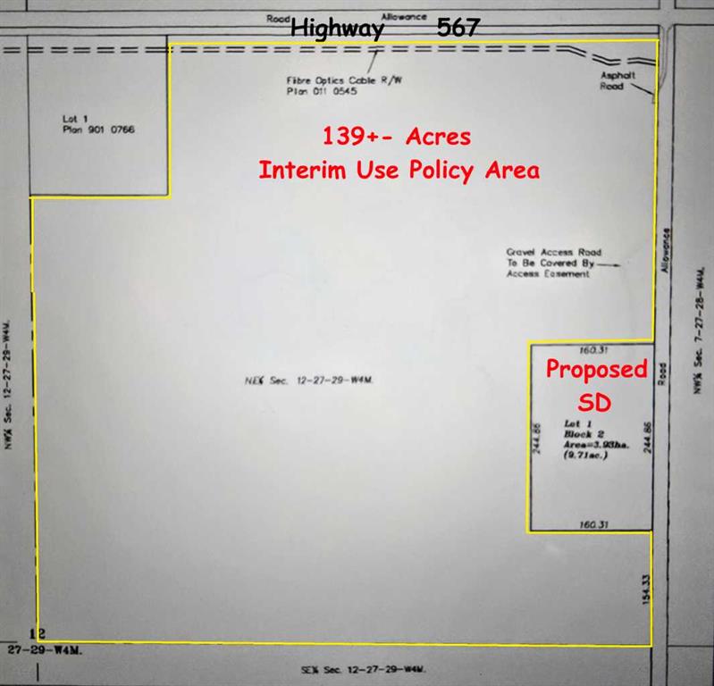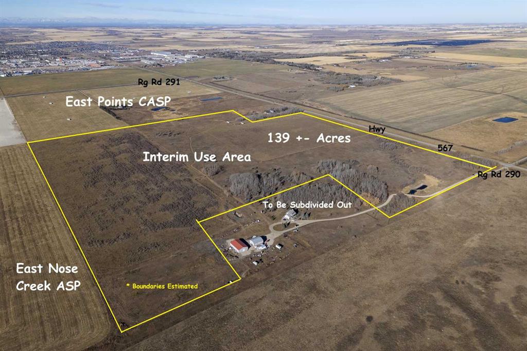 139+- Acres inside AIRDRIE, Alberta fronting on Highway 567 and within City of Airdrie Interim Use Policy Area. Located immediately north of the East Nose Creek Community ASP and immediately east of the East Points Industrial Community ASP. Excellent current opportunity for Interim business uses (by permit) and excellent future development potential. Great high visibility location with 1,900 feet fronting Highway 567 (Veterans Boulevard) and bordered on the east by Range Road 290 (future Rg Rd 292 alignment). Sale is SUBJECT TO City approval of the Landowner completing subdivision of a 10+- acre homesite and issuance and registration of new titles for the properties. GST may apply.