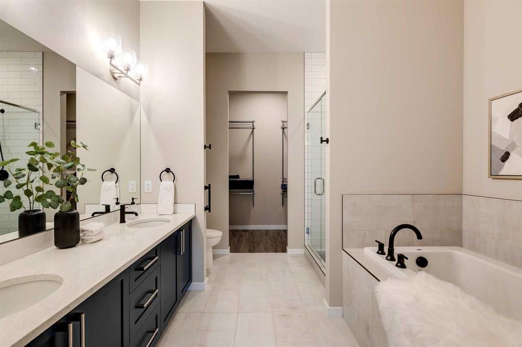 The living room centres around a beautiful gas fireplace and flows seamlessly through sliding doors to the outdoor deck, complete with a covered pergola and fully-landscaped yard. The light-filled primary suite offers a serene retreat with a generous 5pc ensuite featuring a large tiled walk-in shower, deep soaking tub, and dual vanities with generous storage. A well-appointed walk-in closet provides ample space for future built-ins or customization.