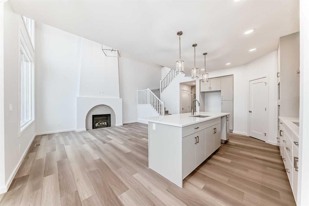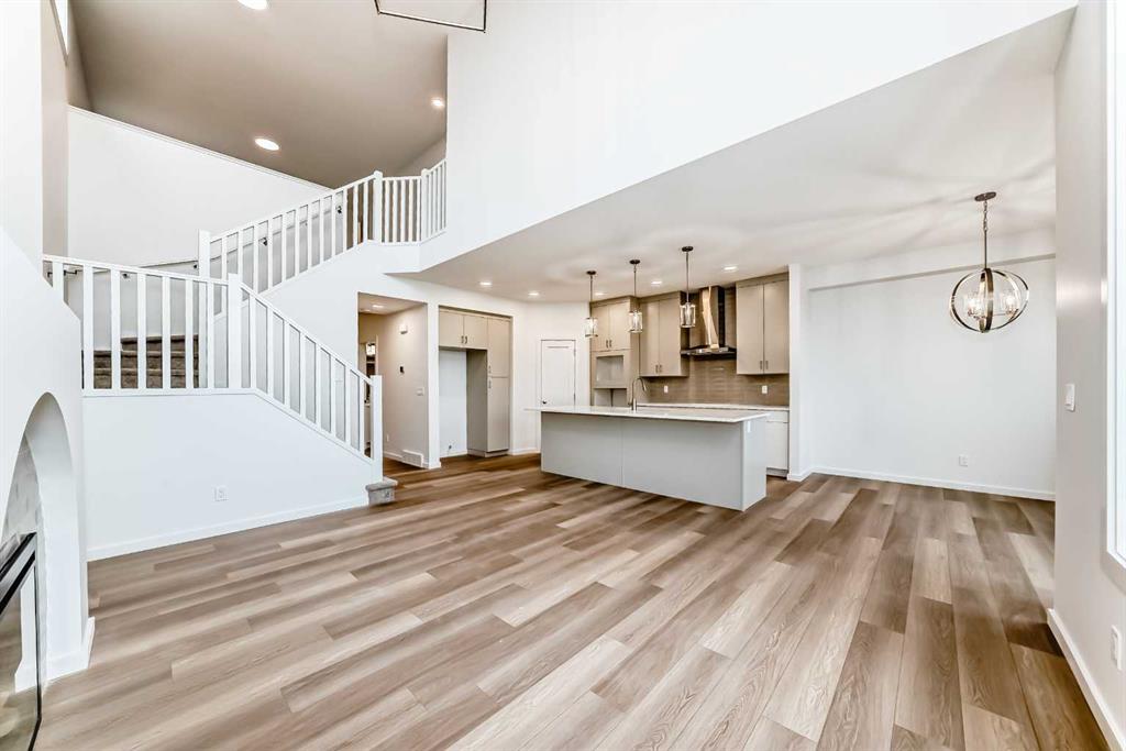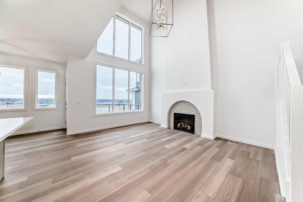 Then you walk in—and it opens up. TWO-STOREY HEIGHT. A full wall that climbs with windows set high, pulling in light and sky. And right there, ANCHORING IT ALL, IS THE FIREPLACE—soft, slightly old-world in the way it tapers up, with an arched detail and tile inset. It doesn’t compete with the room—it gives it a focal point.
