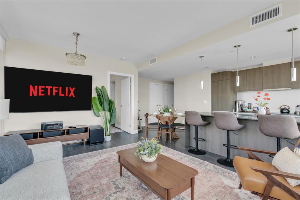 The thoughtfully designed layout features a large, open-concept living area, ideal for both relaxing and entertaining. The modern kitchen is equipped with quartz countertops, Italian Armony Cucine cabinetry, and a sleek induction cooktop, blending style with functionality. The unit includes two well-sized bedrooms and two full bathrooms, offering comfort and privacy for residents, guests, or shared living. Step out onto your private balcony with BBQ, perfect for enjoying morning coffee or evening skyline views in your own outdoor space. This home has been exceptionally maintained and thoughtfully styled, creating a warm, upscale feel that stands apart from standard builder-grade units.