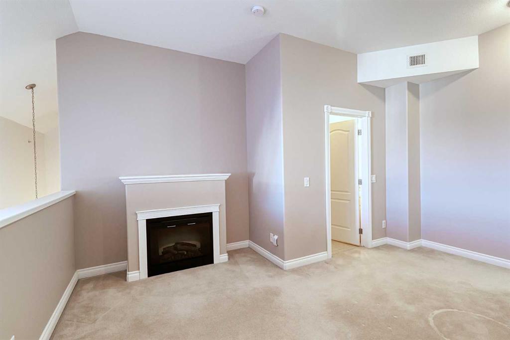 The primary bedroom features a dramatic vaulted ceiling, walk-through closet, and private 4-piece ensuite with double vanity. A second bedroom, additional 4-piece bathroom, and an open loft overlooking the living room complete the layout. The loft includes a 2-piece bathroom and electric fireplace, ideal for a home office or flexible living space.