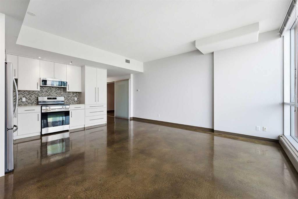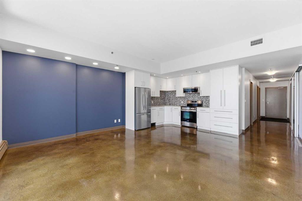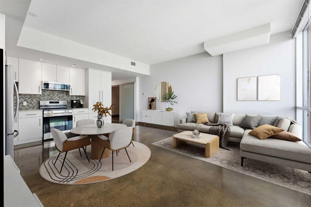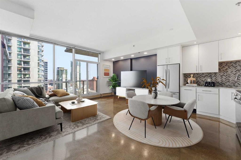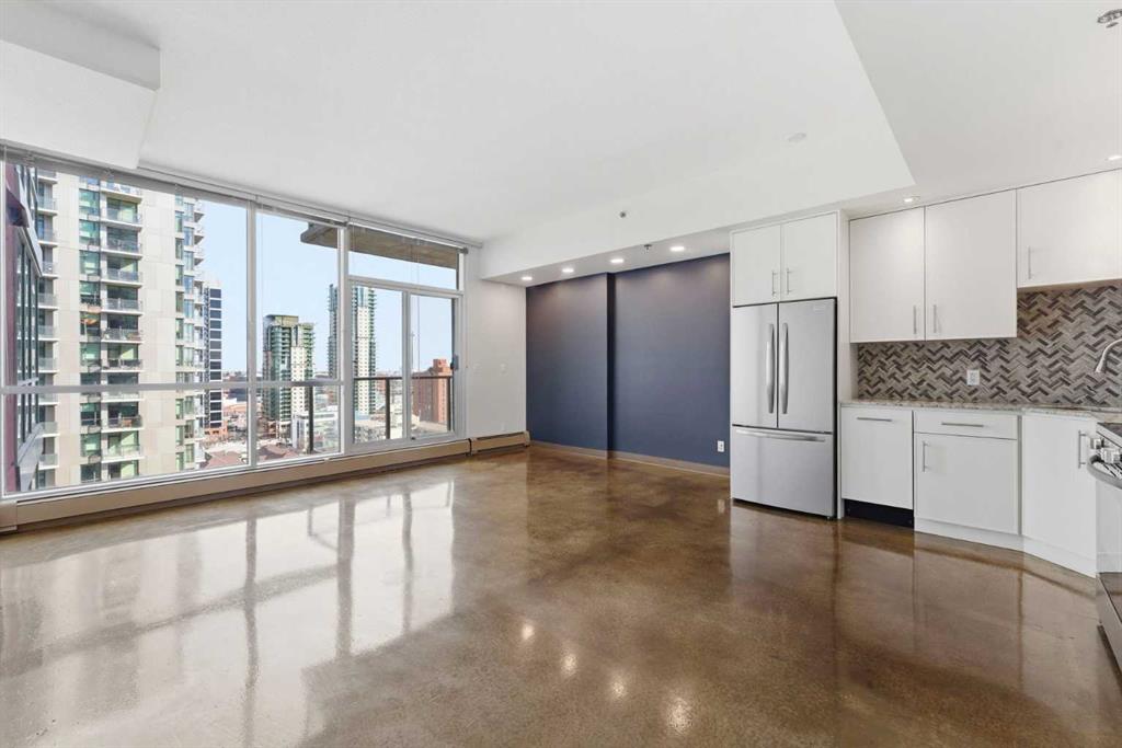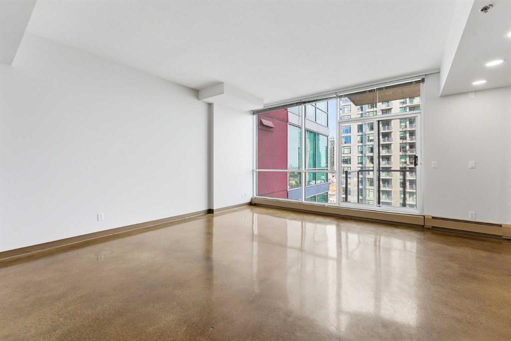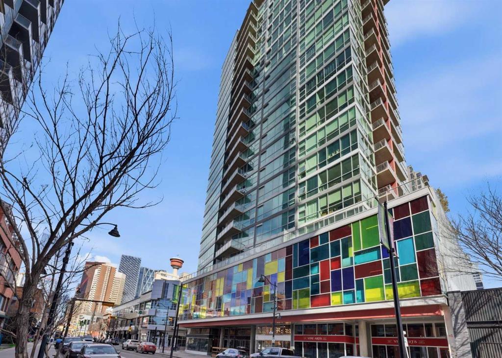 Take a look at this excellent opportunity for a stunning well priced 2 bedroom 2 bath unit located in the heart of Calgary. Just steps away from some of the cities best restaurants, cafes, pubs and local shops, this condo perfectly incorporates modern city life with comfortable living. This future home takes convenience and functionality to the next level, with an in-unit laundry room, storage, and a titled parking stall. Gleaming polished concrete flooring runs throughout the entire unit. A large open-concept living room with floor to ceiling windows bathes the entire space in natural light, perfect for hosting or daily relaxation. The kitchen, equipped with modern upgrades that provide greater comfort and convenience. Approximately 1.5 yrs ago the kitchen was remodeled with extended height cabinets that now reach the ceiling, a larger pantry with pot drawers, all new back splash and a new stainless steel appliance package, including a french door fridge with a freezer drawer, hidden dishwasher with a cabinet panel and extra lighting. The kitchen is an ideal work space offering plenty of counter and tons of cupboard space. Both bedrooms are purposefully placed to provide maximum privacy and comfort for the owners or guests. The master suite includes a full 4-piece en-suite. Sliding glass doors open to the second bedroom (office or flex space) perfect for guests with a full 3-piece bathroom located just steps away. With Stampede Park and local cafes just minutes away, this unit provides a vibrant urban lifestyle that perfectly encapsulates modern downtown living and local convenience. This condo offers the flexibility perfect for first time buyers, young couples or investors.