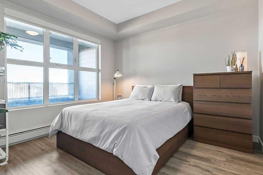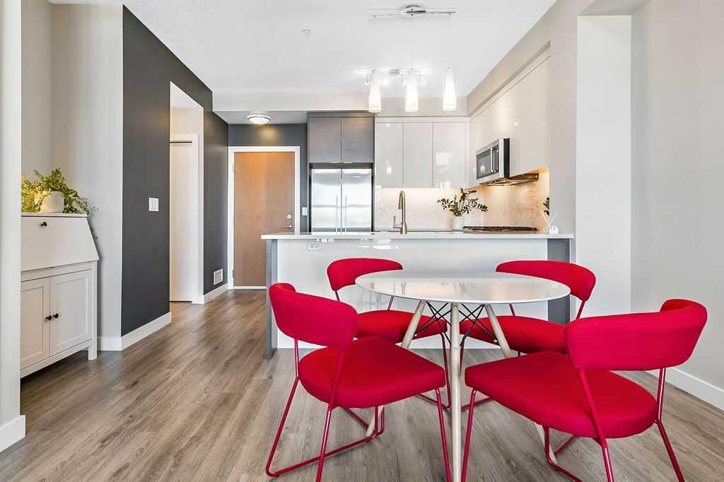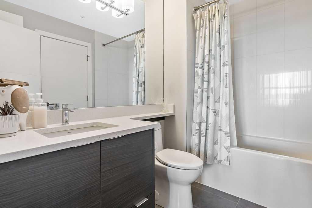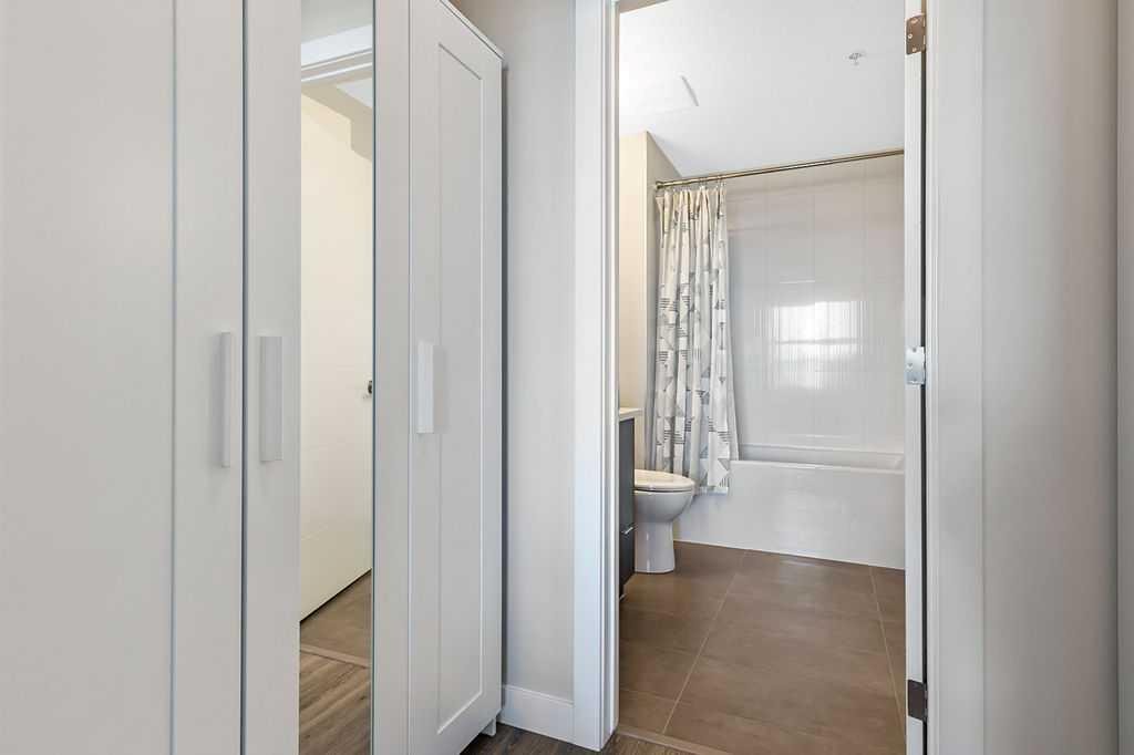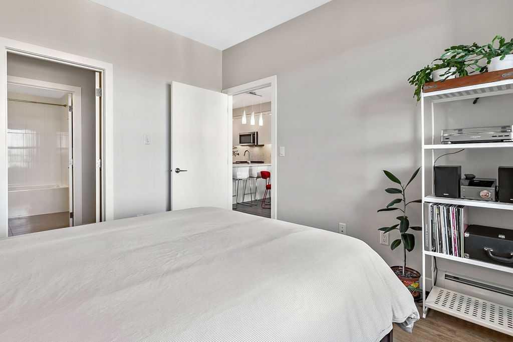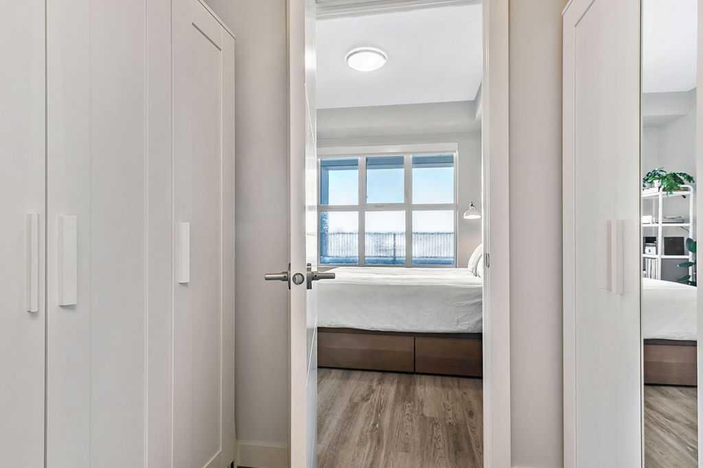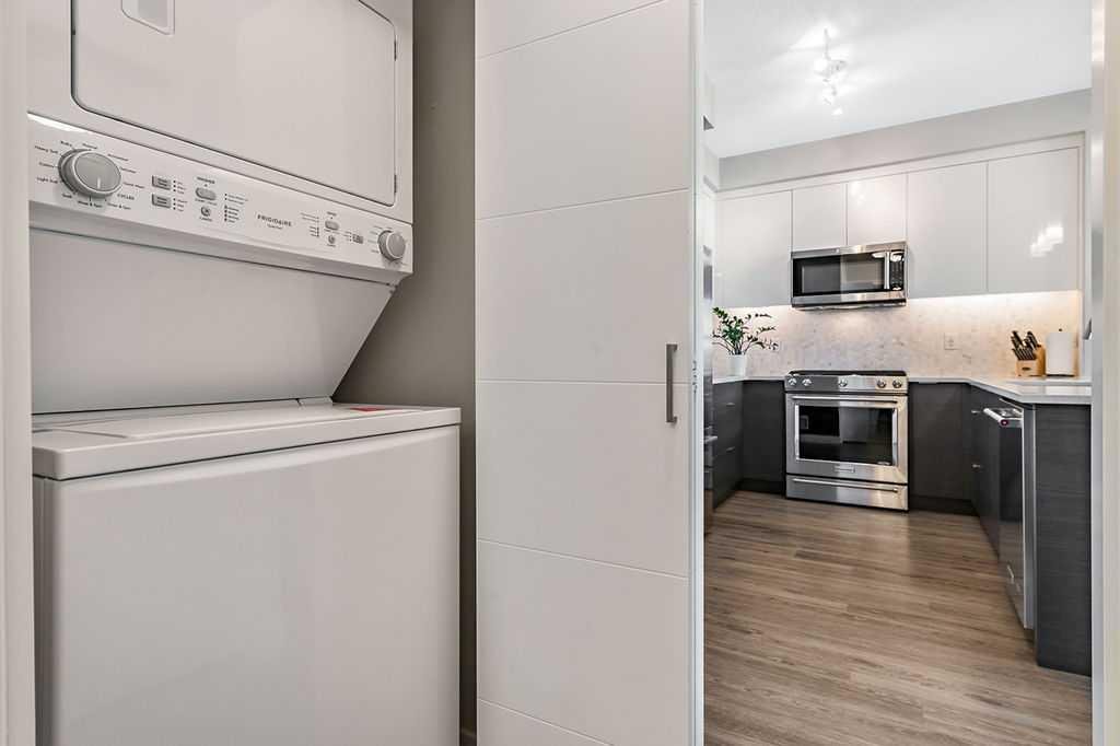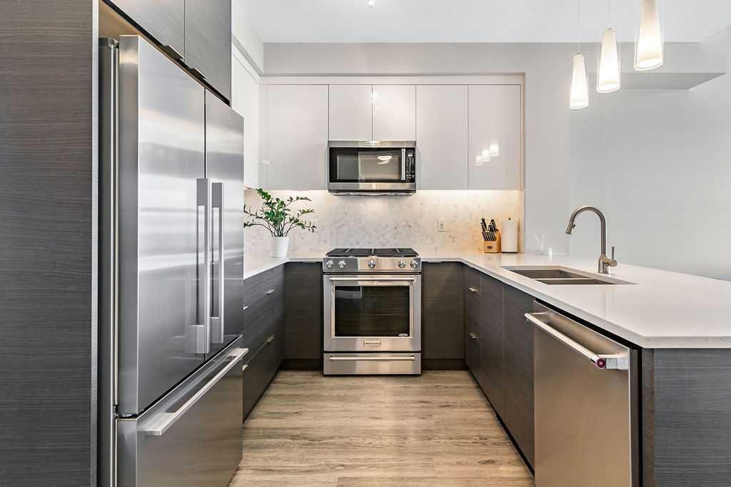 A quiet confidence you notice the moment you step inside. Sitting at the top, where the light lingers just a little longer and the noise fades into the background. Ceilings stretch nearly 13 feet high, giving room to breathe and room for your life to unfold in a way that feels expansive, not confined. Every evening, golden light spills through windows, dancing across the open-concept space, warming the two-tone cabinetry and catching the subtle shimmer of the designer backsplash. The kitchen has been thoughtfully elevated with sleek upgraded appliances, clean lines, and finishes that feel as beautiful as they are functional. Conversations flow easily here, from the kitchen to the living space, carried by light and openness. And just beyond the windows, a view over the rooftops reminds you; you’re above it all. The bedroom is generous, calm, and restorative, with a walk-through closet thoughtfully finished with organizers that keep everything in its place. And then your bathroom. A space that invites you to slow down, exhale, and stay a little longer. Crafted with all the details you’d expect and a few you didn’t know you needed. 40+ visitor underground parking stalls and even a car wash, tucked conveniently within the building, because ease should be part of everyday living. Not just a top-floor condo. Your new home where light, space, and location come together, effortlessly.