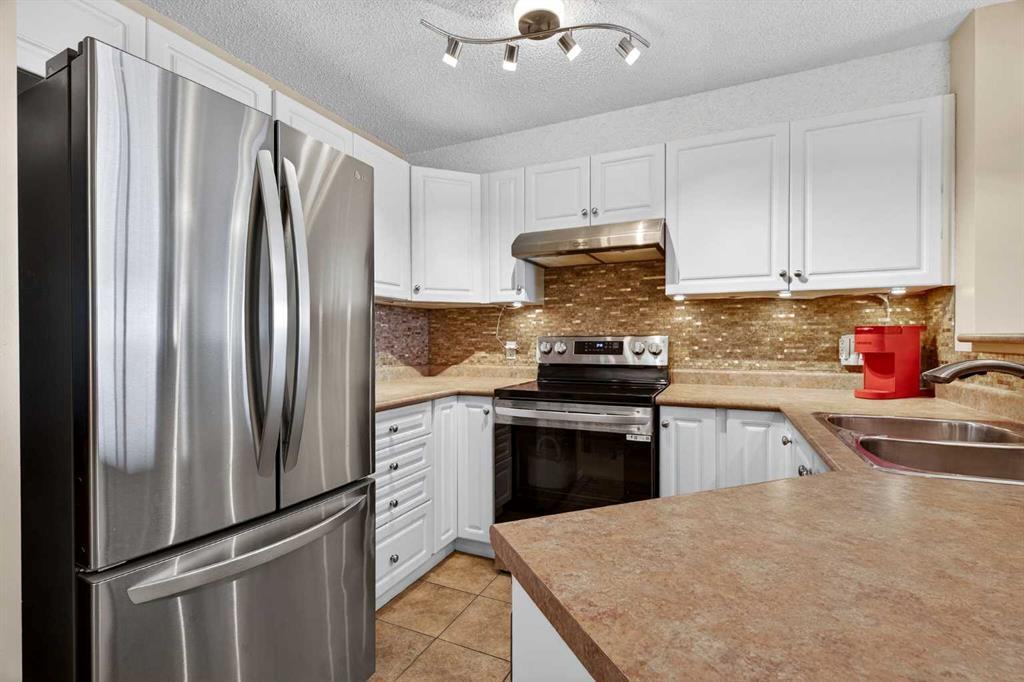 The kitchen features white cabinetry, stainless appliances, and tiled flooring — with all appliances replaced in 2022 for added peace of mind. The bathroom has been completely renovated and includes a tiled bathtub, a modern vanity with plenty of drawers, a wide mirror, and a convenient medicine cabinet.