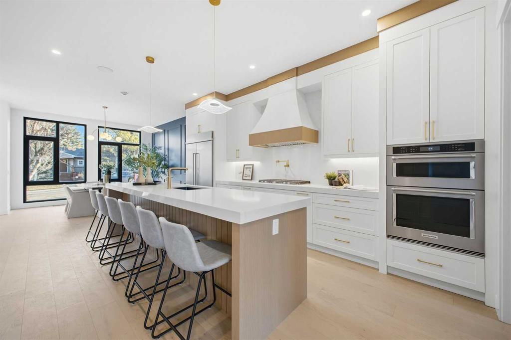 The main floor impresses with soaring 10-foot ceilings, wide-plank engineered hardwood flooring, and 8-foot doors. The gourmet kitchen features quartz countertops, a gas stove, built-in microwave, hood fan, custom cabinetry, a walk-in pantry, and a large island with breakfast bar seating. A formal dining area and a cozy living room with gas fireplace and built-in millwork complete this elegant open-concept space. A stylish powder room with designer lighting and custom vanity adds to the home’s appeal.