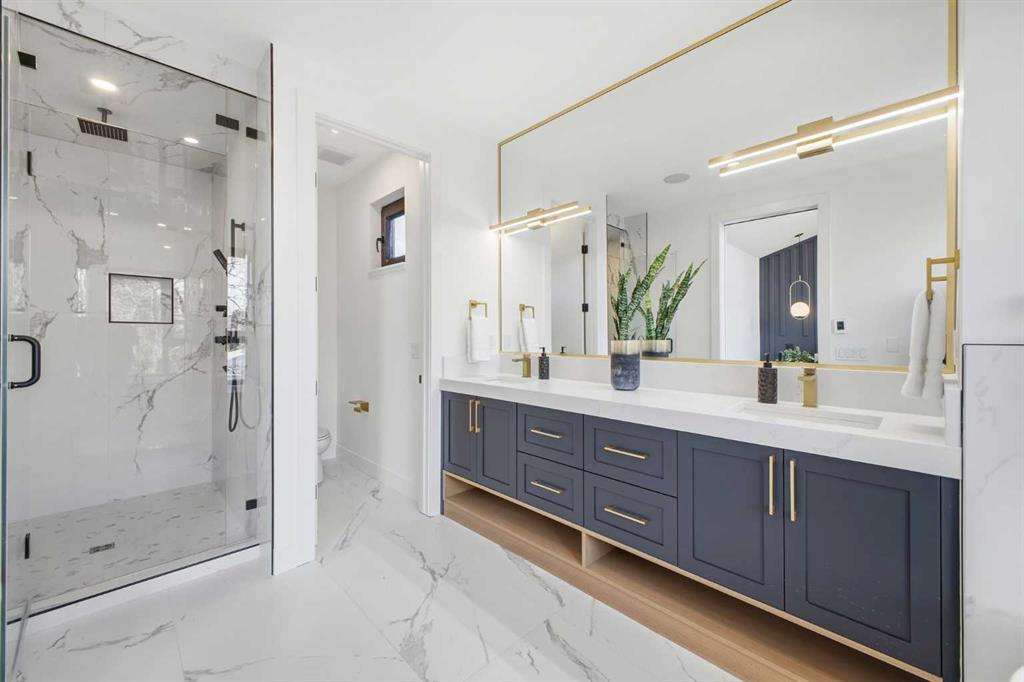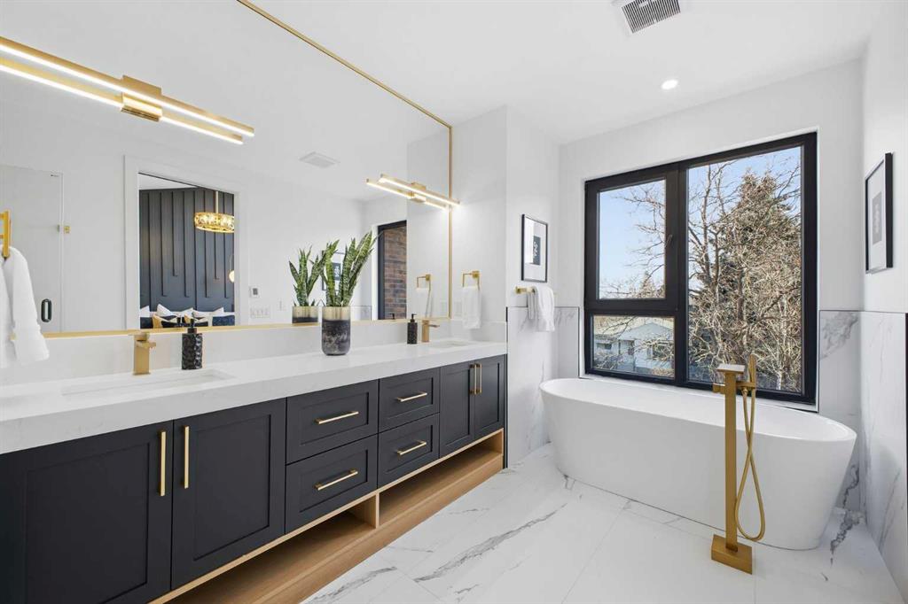 Upstairs, you’ll find 9-foot ceilings throughout, an expansive primary bedroom with large windows and 13.5 foot vaulted ceilings, a walk-in closet with custom built-ins, and a luxurious 5-piece ensuite with in-floor heating, dual sinks, quartz counters, freestanding soaker tub, and a tiled glass shower. Two additional bedrooms offer generous space and light, while the main bathroom includes double sinks and full-height tile tub surround. The upper floor also features a spacious laundry room with built-in cabinetry and a linen closet.