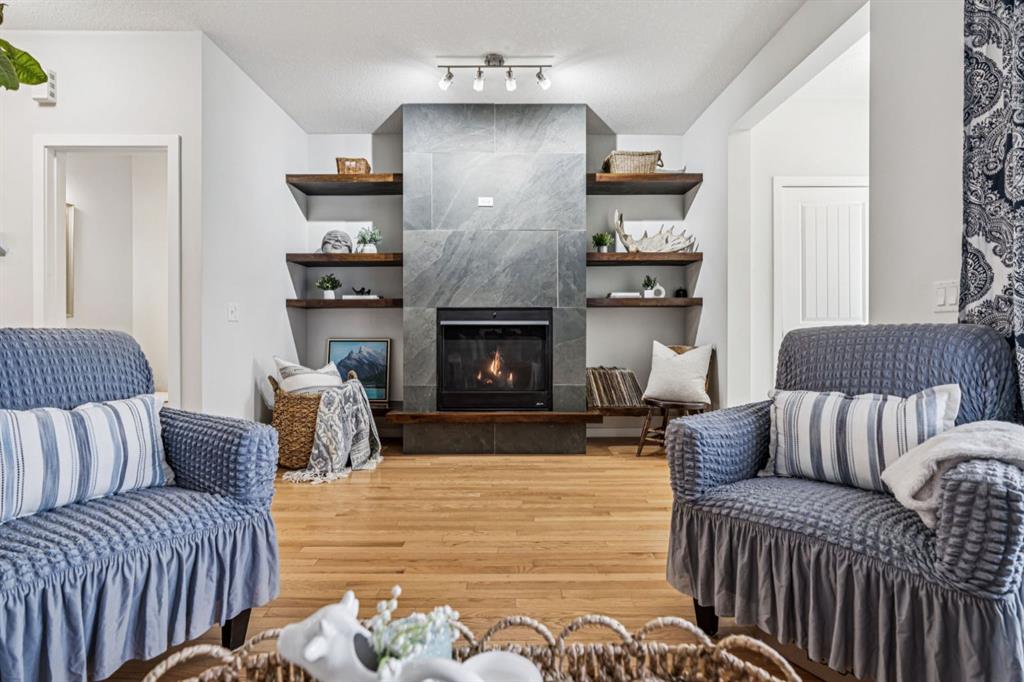 Welcome to this well appointed home in the desirable community of Fireside! The main level offers a warm and inviting living space highlighted by a stunning gas fireplace with floor-to-ceiling tile and built-in shelving. The stylish kitchen features quartz countertops, a gas cooktop, French door fridge, microwave hood fan, and a newer dishwasher, all flowing seamlessly into the dining area—perfect for everyday living and entertaining. Step outside to enjoy the south facing backyard complete with a full width deck, front veranda, fencing, and added storage with an outdoor shed.