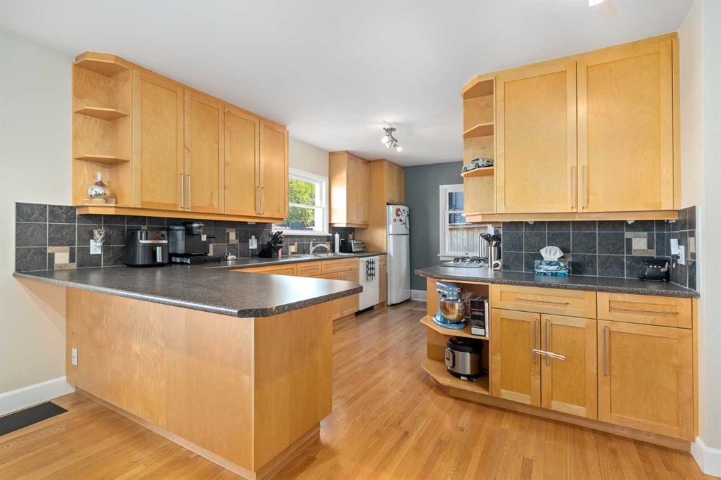 Welcome to this charming mid-century bungalow, perfectly situated on a generous 60′ x 110′ lot with sweeping views of downtown Calgary. Renovated in 2000, this solid home offers timeless character with modern updates, featuring 2 spacious bedrooms on the main level both with ensuite bathrooms, the primary features a beautiful steam shower with multiple Grohe heads, and an additional bedroom in the fully developed basement. The beautiful maple kitchen has plenty of storage and countertops with downtown views from the kitchen and dining room windows.