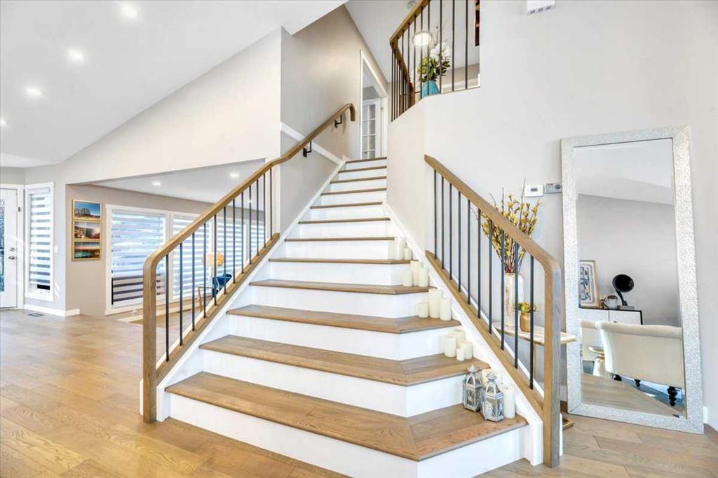 As soon as you walk in, you’re welcomed by a space that feels open, yet still defined and inviting. The main entry gives you a generous receiving area, easily big enough for a piano paired with a grand staircase that’s angled just right to warmly welcome you home.
