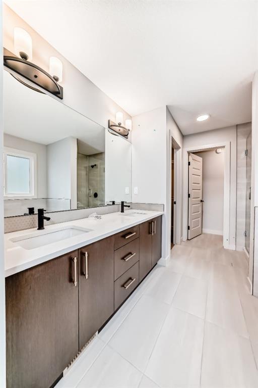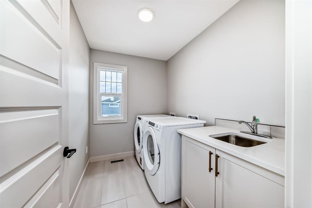 All four bedrooms include walk-in closets, and the spa-inspired primary ensuite boasts a soaker tub and full glass shower. The upper floor also offers a large laundry room with built-in cabinetry and sink for added convenience.