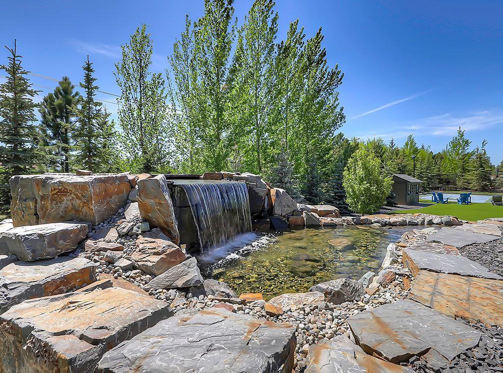 Outside, the property unfolds like a private park, an achievement of landscape architecture rarely seen at this scale. The Rocky Mountain inspired waterfall and meandering creek set a tranquil tone as they flow beside the expansive poured aggregate patio, surrounded by towering evergreens and deciduous trees, layered greenery, and meticulously crafted stonework. The result is a lush, immersive environment that feels alive in every season.