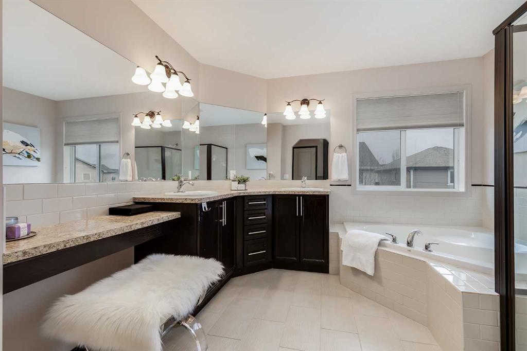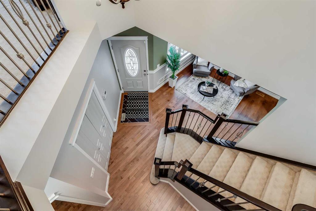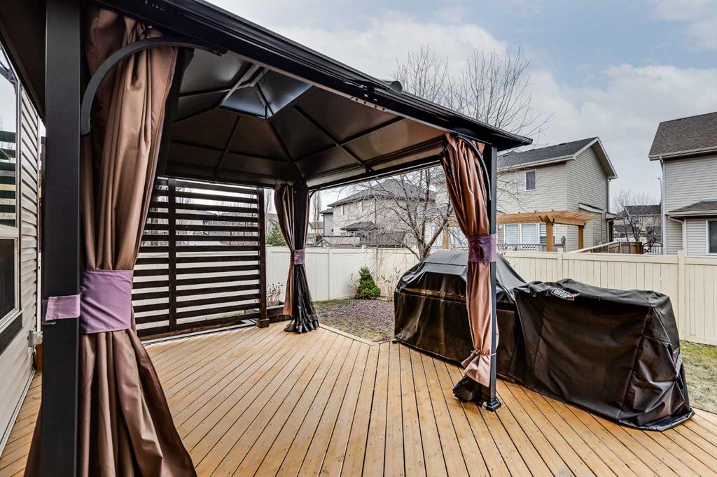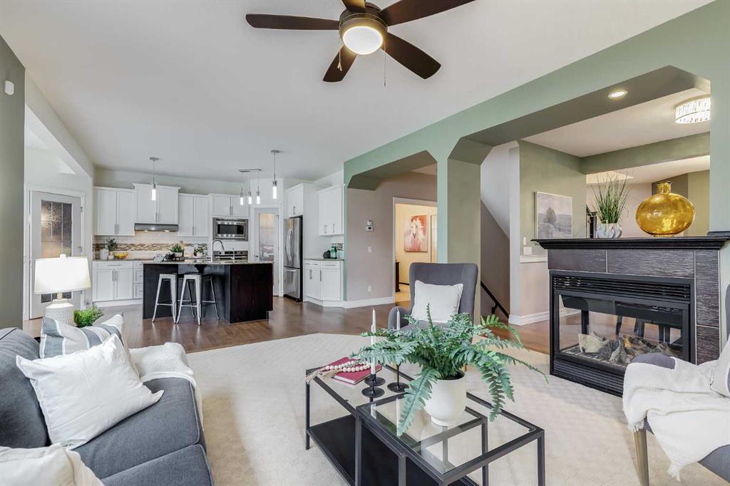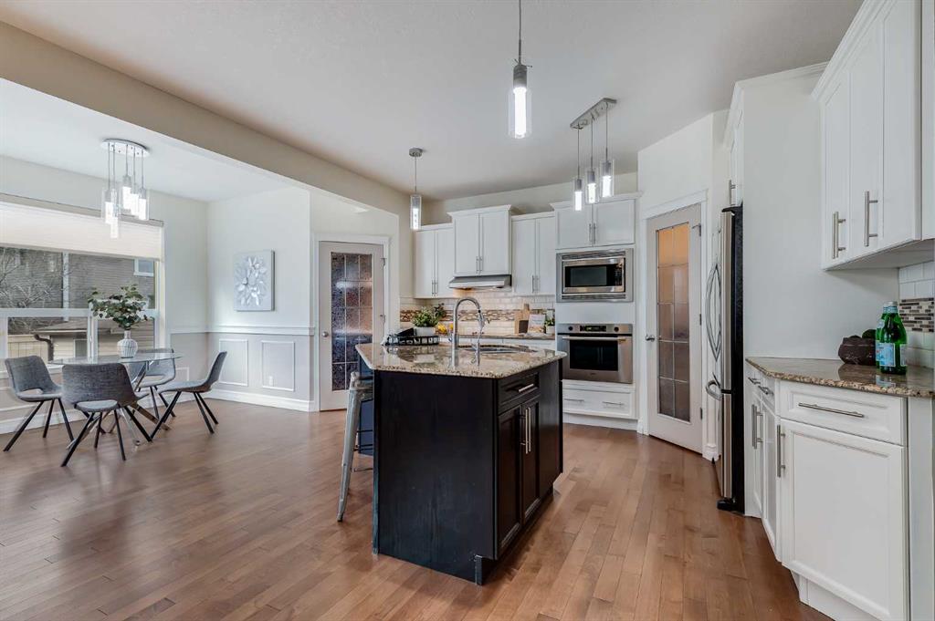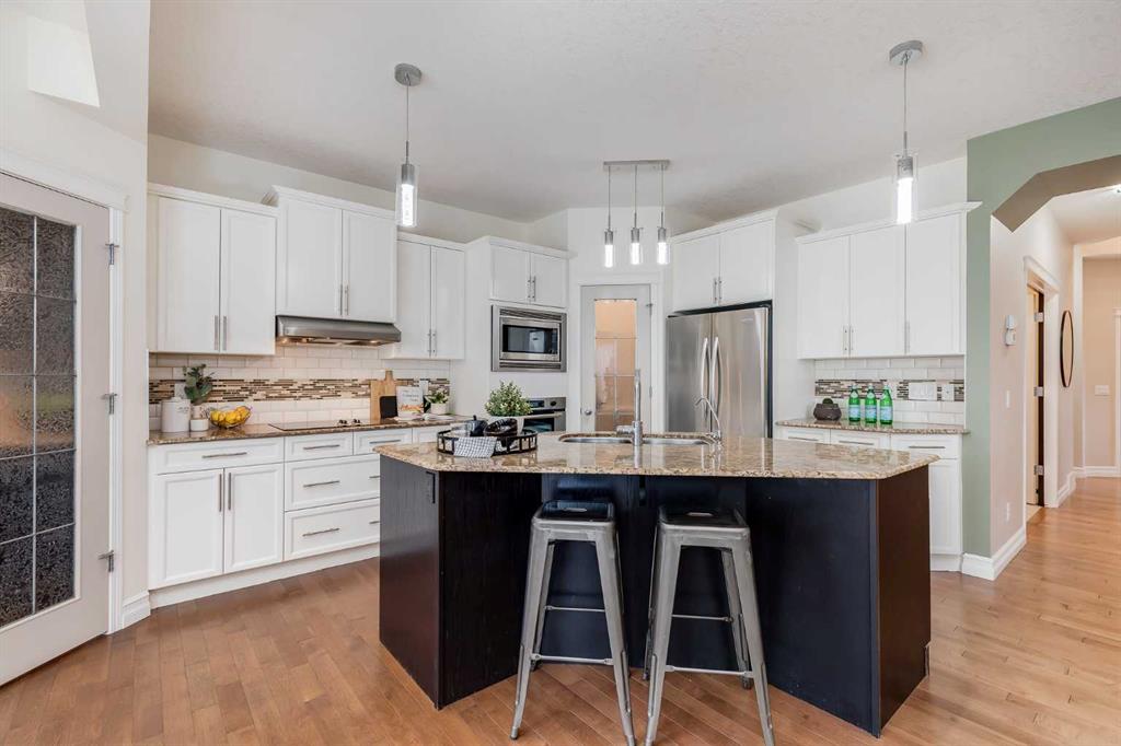 Location, location, location! This is one you don’t want to miss. With over 2,700 sq. ft. of beautifully designed living space, this home is perfect for a growing family or multi generational living. Ideally situated within walking distance to schools, shopping, and with quick access to Highway 2, convenience is at your doorstep. Immaculate hardwood floors welcome you the moment you step inside. A formal living/dining room sits to the right of the central staircase—ideal for family gatherings or quiet evenings. The three sided fireplace creates a warm transition into the second living room, a cozy retreat for everyday relaxation. The chef’s kitchen is a showstopper: two tone cabinetry, granite countertops, built in wall oven and microwave, sleek cooktop, and a large island for effortless prep. An added bonus is the butler’s kitchen with gas range that offers extra cooking space—perfect for entertaining or meal prep. A charming breakfast nook opens to the backyard, where you’ll find a large deck with pergola, built in BBQ, and hot tub—your summer oasis! A spacious home office on the main floor, with French doors (desk included) makes working from home a breeze. The oversized, heated garage entrance features a walk in closet and separate laundry room for ultimate functionality. The upper level of this home is equally impressive. Including an expansive bonus room with space for large furniture, a media setup, or even a library/games area. The luxurious primary suite has an impressive L shaped walk in closet (with built ins) and a spa inspired 5 piece ensuite. Two additional oversized bedrooms, each with walk in closets, easily accommodating king beds or multiple beds and a main four piece bath complete this level. Some Extra Features of this property include: vinyl fencing on both sides of the property, Central vacuum system, reverse osmosis, and water softener, 9 ft basement ceilings (ready for future development), Alarm system (contract with Airdrie Alarm), BRAND NEW ROOF AND SIDING ON SOUTH EXPOSURE (Nov 2025) and all carpets professionally cleaned and sanitized!!