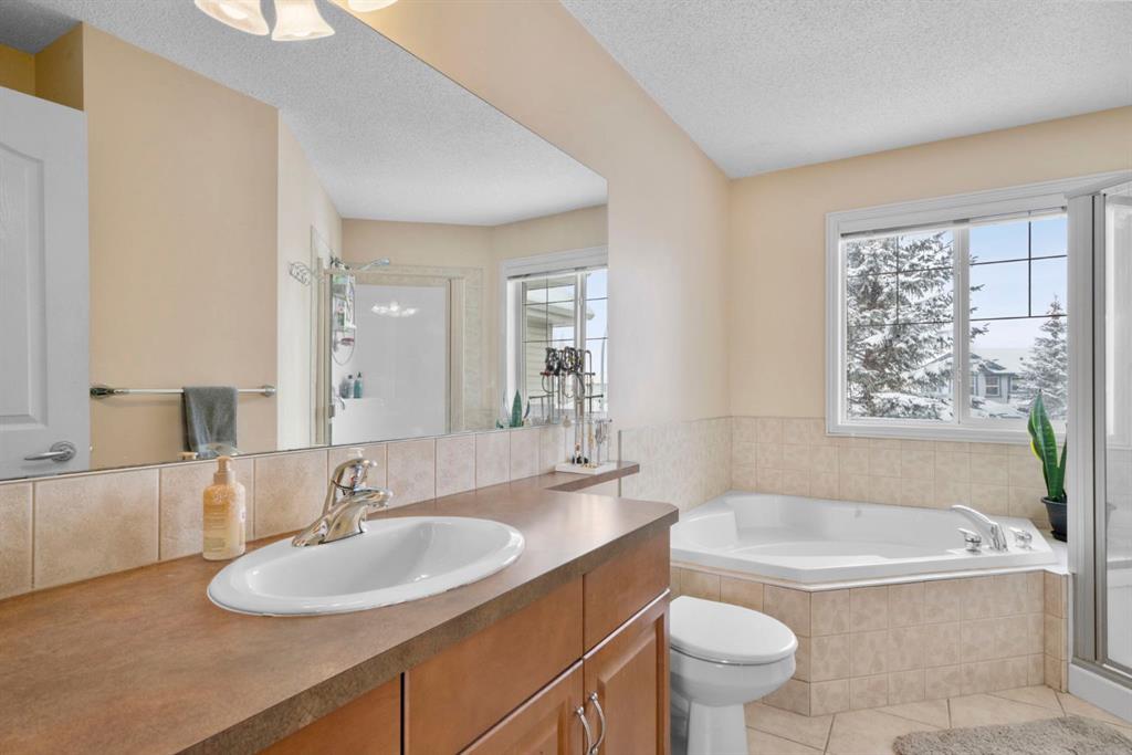 The upper level showcases a unique split staircase leading to a versatile bonus room, ideal for a family lounge, home office, or gym. The spacious primary bedroom offers a peaceful retreat with a walk-in closet and a large 4-piece ensuite featuring a soaker tub and separate shower. Two additional well-sized bedrooms and a shared 4-piece bathroom complete this level, providing excellent space for growing families.