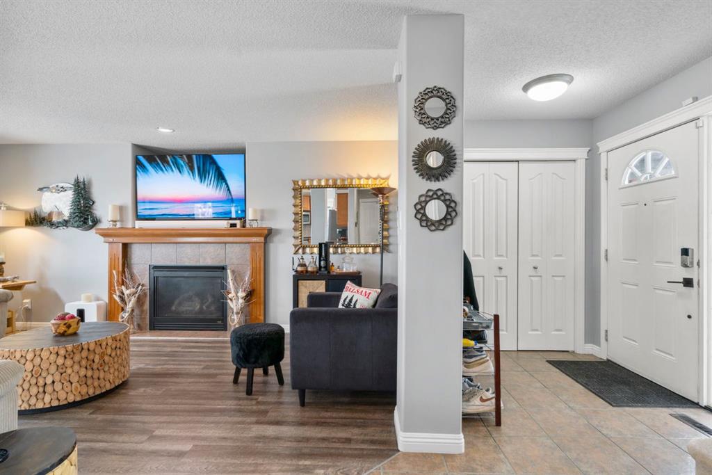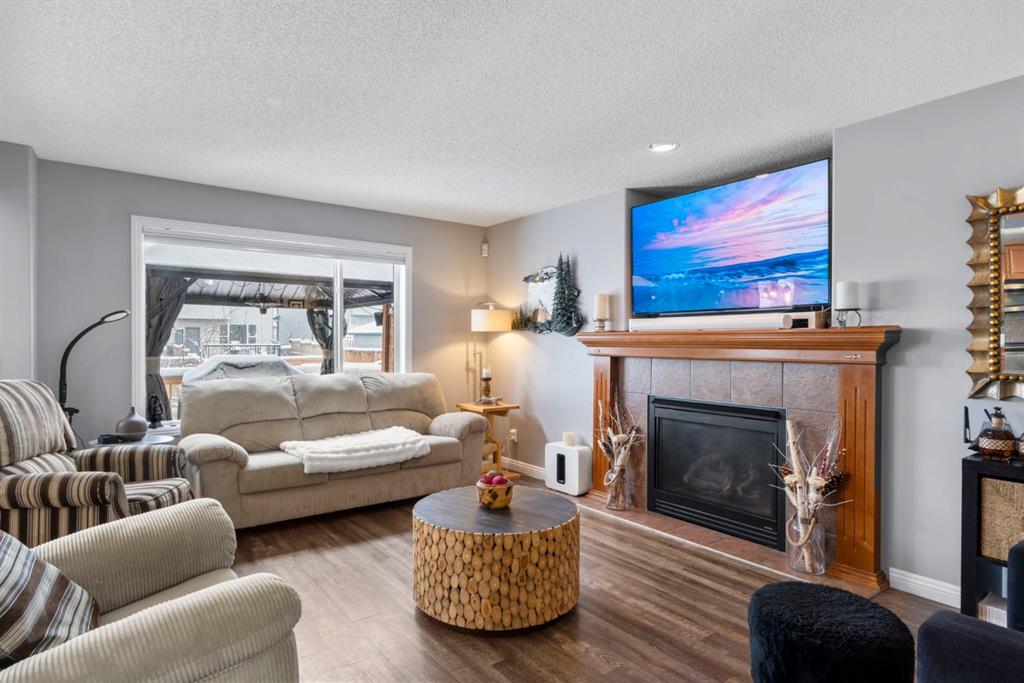 Step inside to an open-concept main level designed for both everyday living and entertaining. The spacious living room features a cozy gas fireplace and large windows, creating a bright and inviting atmosphere. The kitchen is well-appointed with updated appliances, a center island, and a convenient pantry, seamlessly connecting to the dining area and overlooking the backyard. Step outside to the deck and concrete pad with back alley access perfect for summer gatherings or relaxing outdoors. A powder room and laundry area complete the main level.