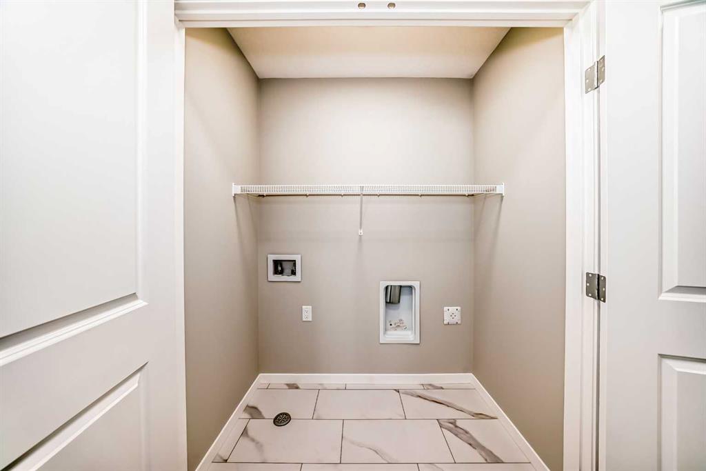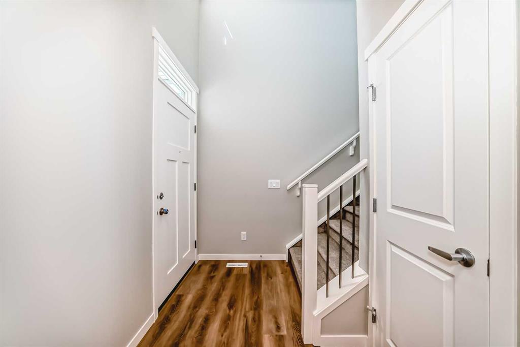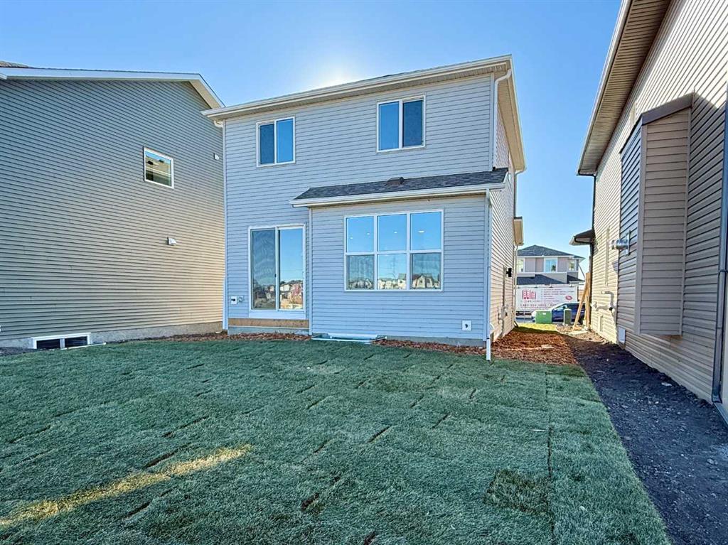 Welcome to the exquisite “Carisa” floor plan, where nearly 1,700 SqFt of thoughtfully designed space combines modern elegance with unmatched functionality. This home’s layout is tailored for both comfort and style, creating the perfect setting for family living and entertaining. As you step inside, you’ll be greeted by the warmth and durability of vinyl plank flooring that flows seamlessly throughout the main level, accentuating the modern finishes and striking architectural details. Natural light pours in through the back wall of windows, infusing the open-concept living areas with an inviting ambiance. Dual sliding patio doors extend your living space to the expansive backyard, ready for your personal touch to create the ultimate indoor-outdoor oasis. At the heart of the home, the kitchen is a chef’s dream. Featuring two-tone cabinetry, sleek quartz countertops, and a stylish tile backsplash that wraps elegantly around a chimney-style hood fan, this kitchen is as functional as it is beautiful. Stainless steel appliances and a thoughtfully positioned mudroom with direct kitchen access ensure that even grocery days are effortless. A cozy dining nook and a spacious living room, are perfectly positioned to enjoy the home’s abundant natural light. The smartly designed pocket office offers the perfect work-from-home setup or a dedicated homework space for the kids. Upstairs, a versatile bonus room serves as the ideal family retreat, separating the serene primary suite from the secondary bedrooms. The primary suite is a tranquil haven, complete with a luxurious 4-piece ensuite featuring an oversized shower and ample space to unwind. The two additional bedrooms are generously sized, making them ideal for children or guests. With an upstairs laundry room and a stylish 4-piece bathroom, convenience is woven into every detail of this home. **This home also comes complete with full front and backyard landscaping, including sod, mulch on the side yards, and trees/shrubs in the front as per community guidelines. Located in the vibrant southeast Calgary community of Hotchkiss, this home offers more than just a beautiful living space. Residents enjoy stunning mountain views, 51 acres of park space, interconnected walking paths, and a central wetland. Designed with families in mind, Hotchkiss is a community where you can truly belong and thrive.
