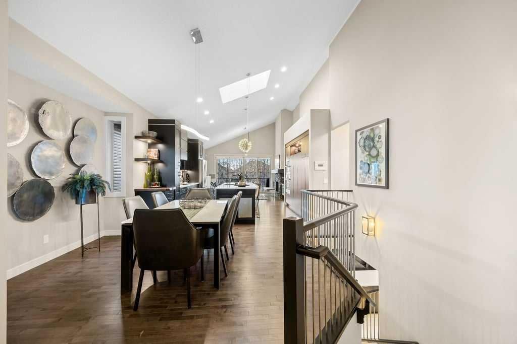 Designed for both everyday comfort and refined entertaining, the main level features vaulted ceilings and a large skylight over the kitchen that fills the home with natural light, refreshed hardwood flooring, upgraded lighting throughout, and elevated finishes at every turn. The chef-inspired kitchen has been beautifully updated with new quartz countertops, a new Blanco sink, premium appliances including an induction cooktop, and seamless flow into the open living and dining areas. The main floor includes a spacious primary retreat with a luxurious 5-piece ensuite featuring a soaker tub and oversized shower, along with a second bedroom or den offering flexibility for guests or a private workspace. The mudroom is enhanced with Denca customized cabinetry, offering both style and exceptional everyday functionality. Just off the living space, a partially covered rear deck with durable Duradek surface and stairs to the backyard creates an ideal setting for outdoor living.
