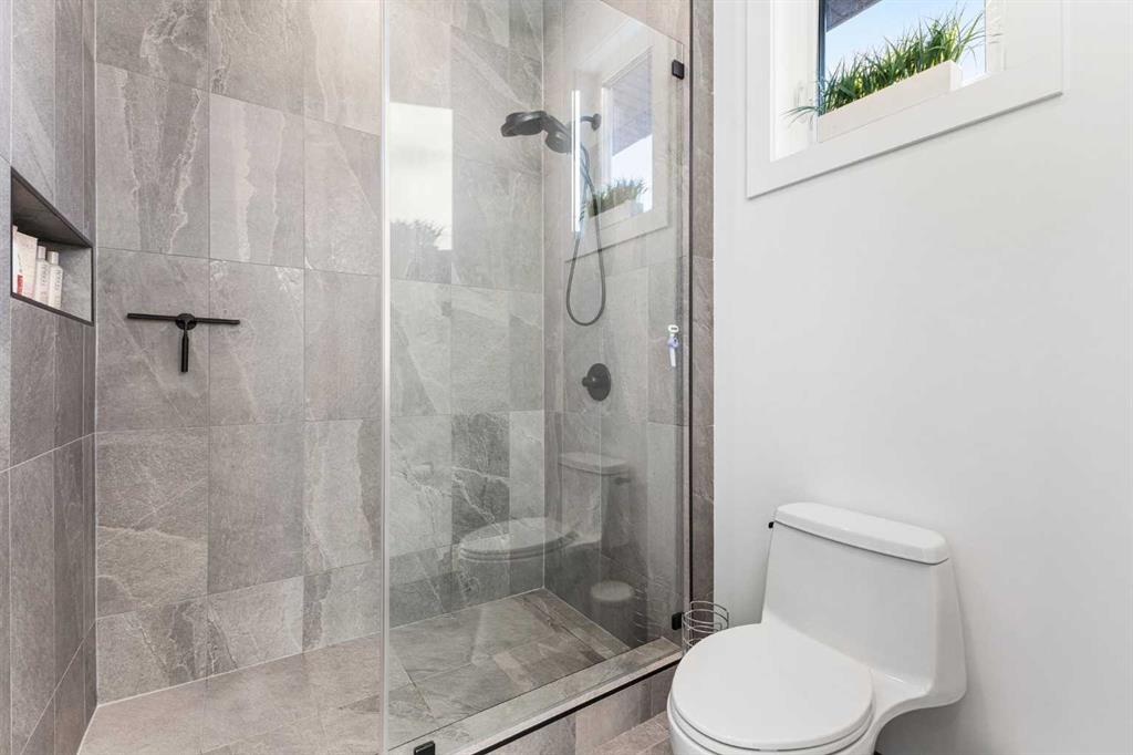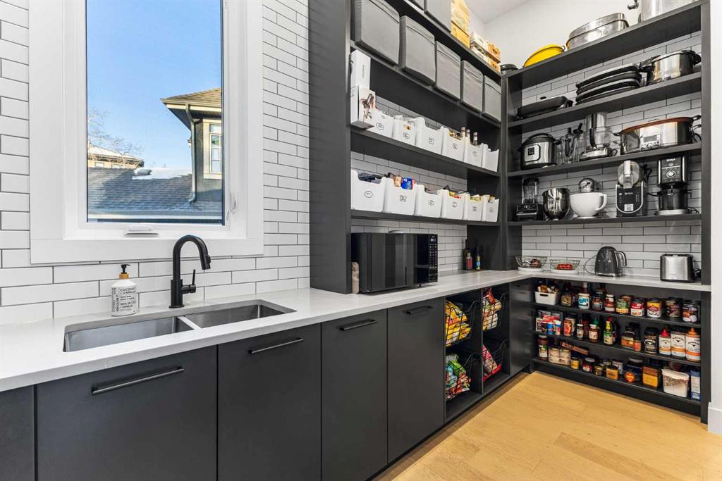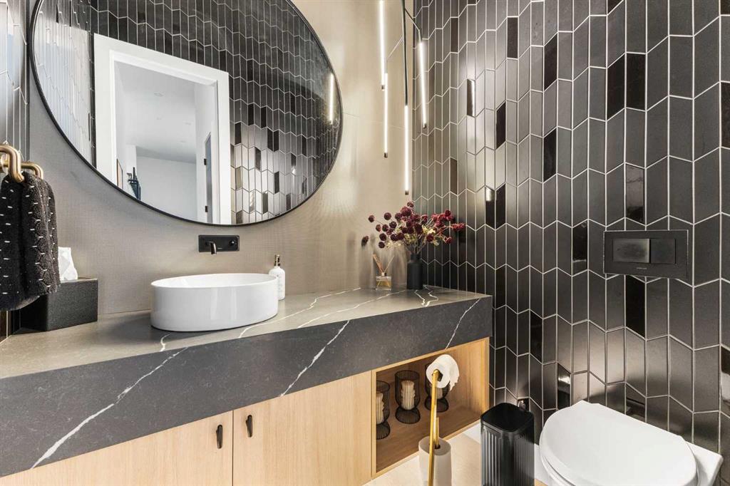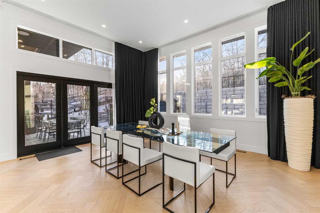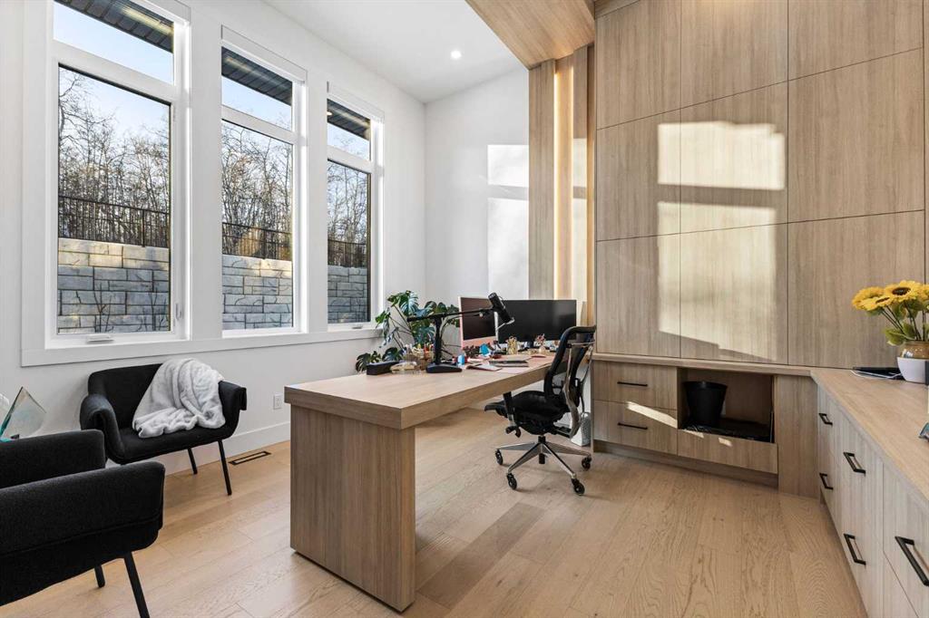 The main floor is built for real life and serious entertaining. The kitchen is expansive with a walk-in pantry and a servery right beside the dining room, making hosting seamless from start to finish. Two accordion doors open wide from the main living area directly to the deck and yard, making the transition from indoor to outdoor entertaining completely seamless. The living room is generous without feeling cavernous, and there’s a proper main-floor office for those who work from home and need a space that feels like one. A main-floor bedroom with its own ensuite rounds things out beautifully ideal for guests, in-laws, or a nanny suite.