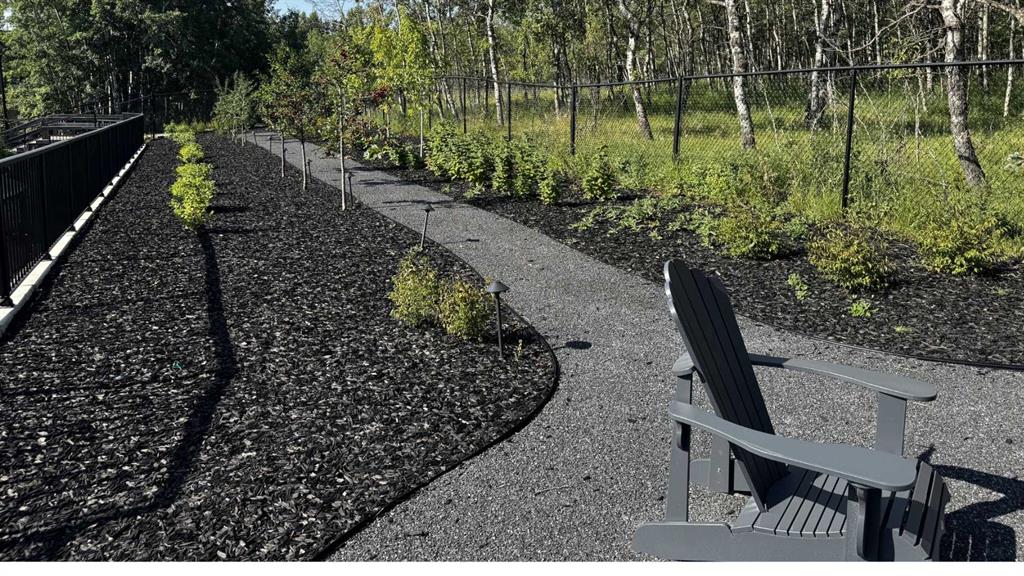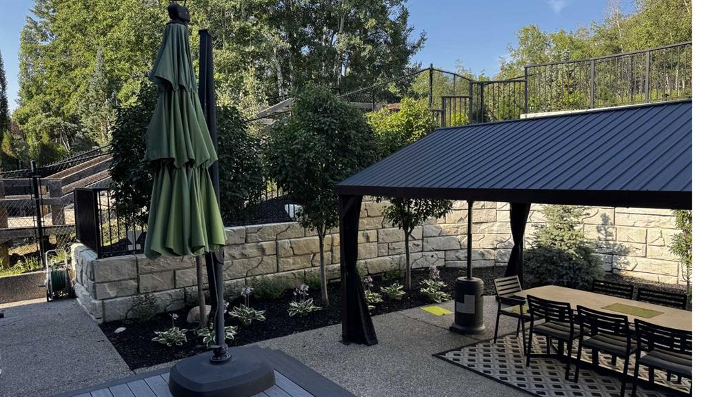 The outdoor space is something you don’t expect until you see it. One of the largest lots in the community at a third of an acre, professionally landscaped and thoughtfully designed for how people actually spend their summers. Underground irrigation keeps everything lush without the effort. Gemstone lighting sets the mood after dark. A gazebo and dedicated firepit area give you every reason to stay outside long after dinner. The upper deck is gas-wired and ready for those evenings that stretch well past sunset. The yard is roughed in for a pool, and backing onto a treed community park means the privacy and greenery extend well beyond your property line.
