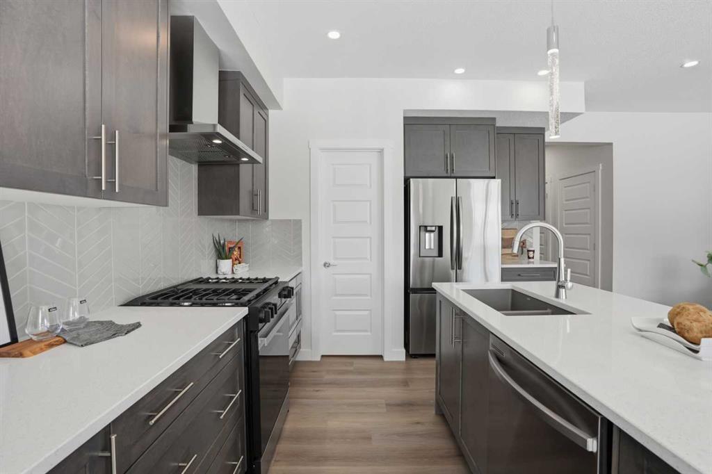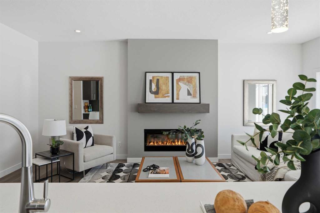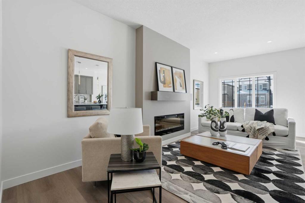 The main level features a private office and a beautifully appointed 3-piece bath, ideal for guests or working from home. At the heart of the home is a chef-inspired kitchen, complete with sparkling quartz countertops, full-height upper cabinetry, premium stainless steel appliances, a generous island with bar seating, and a walk-in pantry—perfect for both everyday living and entertaining. The adjoining living area is anchored by a sleek electric fireplace and enhanced by expansive windows that flood the space with natural light, complemented by modern recessed lighting.