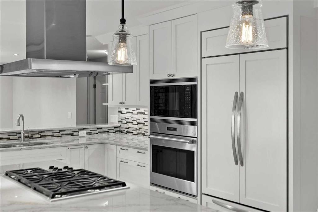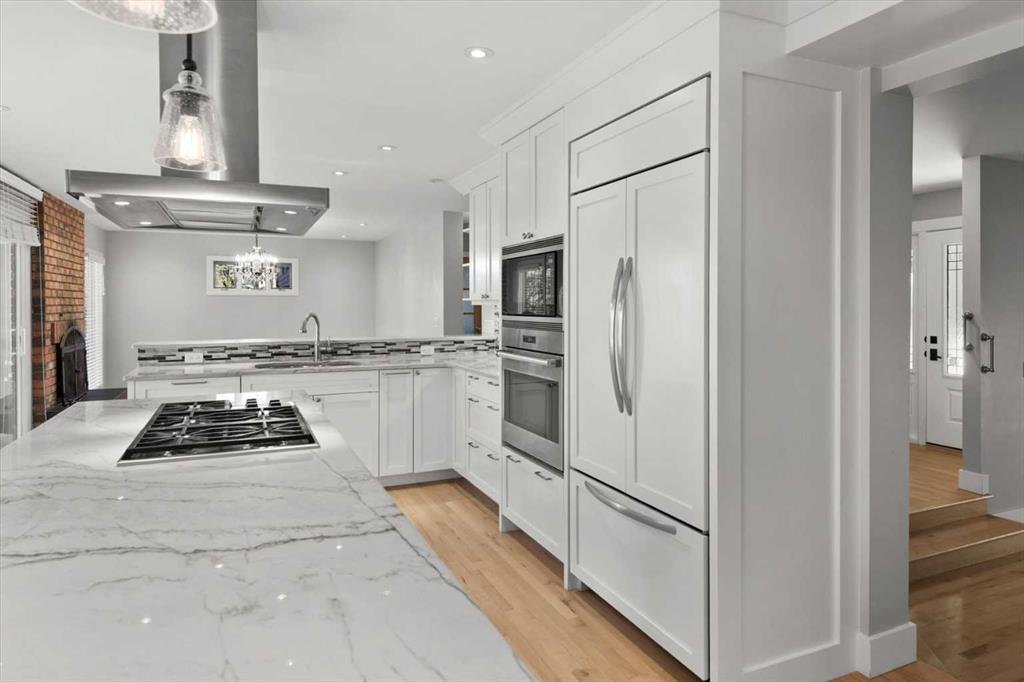 The luxurious renovated kitchen (2015) features a large island with quartz countertops, breakfast bar, and exceptional storage including soft-close drawers (approx. 20), corner organizer, and pullout pantry. Stainless steel appliances (2015) include an integrated-front refrigerator, dishwasher, and bar fridge, plus a gas cooktop with chimney-style hood fan, built-in wall oven and microwave. The kitchen overlooks the warm family room with a brick-faced wood-burning fireplace and views of the fully fenced backyard.