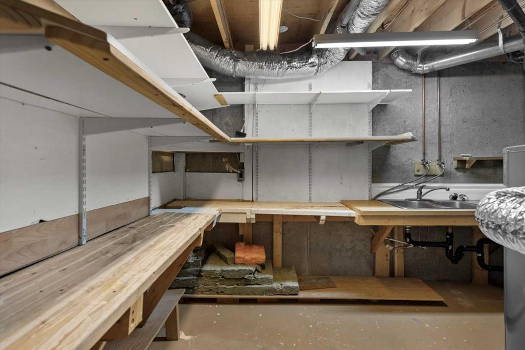 The lower level includes a large workshop with storage shelves, a 5th bedroom/office and family room area.