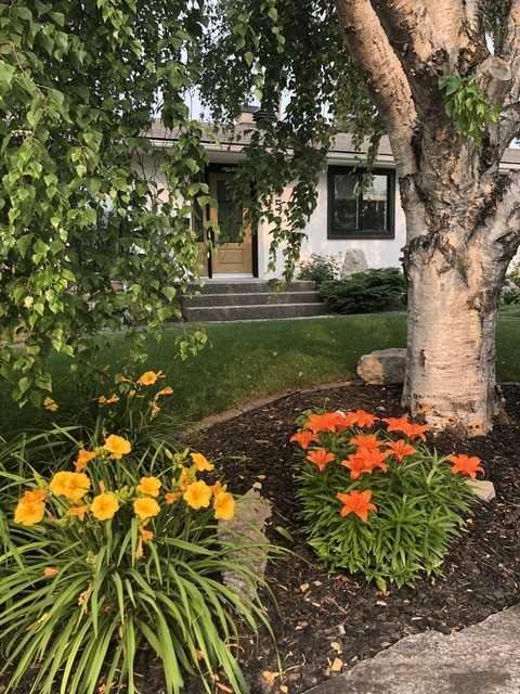 The west-facing backyard is a private outdoor sanctuary, enhanced by over $35,000 in professional landscaping by Green Escape Designs. Extensive stonework, irrigation, and curated plantings — including peonies, hydrangeas, lilies, flowering plum shrubs, cherry and crab apple trees, and established lilacs — create a vibrant garden setting throughout the seasons.