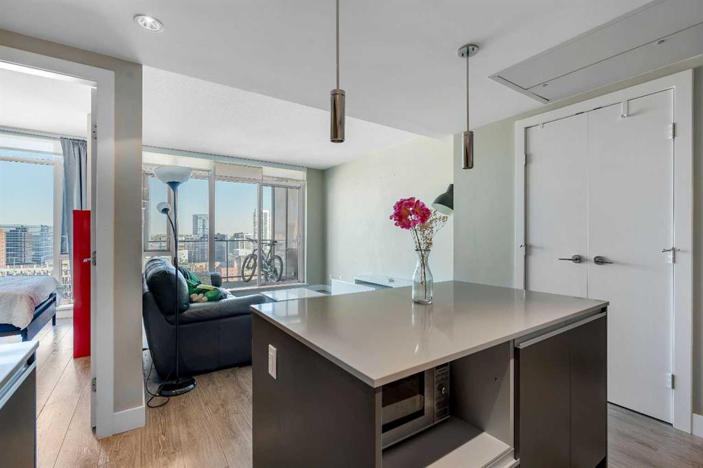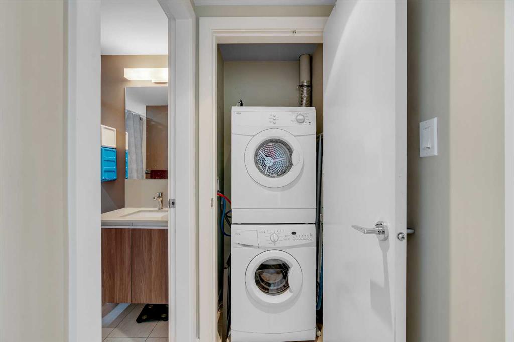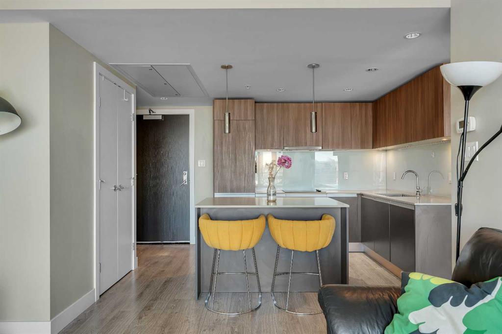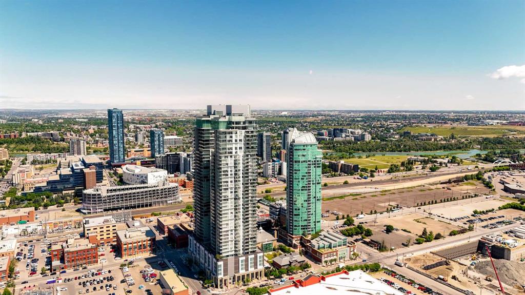 THE ABSOLUTE BEST DEAL IN GAURDIAN TOWERS | CALGARY’S TALLEST RESIDENTIAL TOWER | 1 BEDROOM WITH TITLED PARKING | CITY VIEWS | Located in the heart of the Beltline, this one bedroom residence in The Guardian offers sleek modern living with panoramic city views to the North and West (not facing the other tower). The open concept layout is smartly designed with floor to ceiling windows that flood the space with natural light and connect to a private balcony perfect for morning coffee or evening sunsets. The kitchen is finished with quartz counters, glass tile backsplash, and integrated appliances for a clean contemporary look, while the living and dining area flow seamlessly for everyday living. The bedroom includes a generous closet and the four piece bathroom is finished with modern fixtures and tile. In suite laundry and a titled underground parking stall provide everyday convenience. Residents of The Guardian enjoy premium amenities including a fully equipped fitness centre, social lounge with kitchen, party and recreation rooms, workshop, and concierge with 24 hour security. Just steps to Stampede Park, the BMO Centre, C Train, restaurants, shops, and entertainment, this home is ideal for first time buyers, young professionals, or investors looking for a prime downtown location.