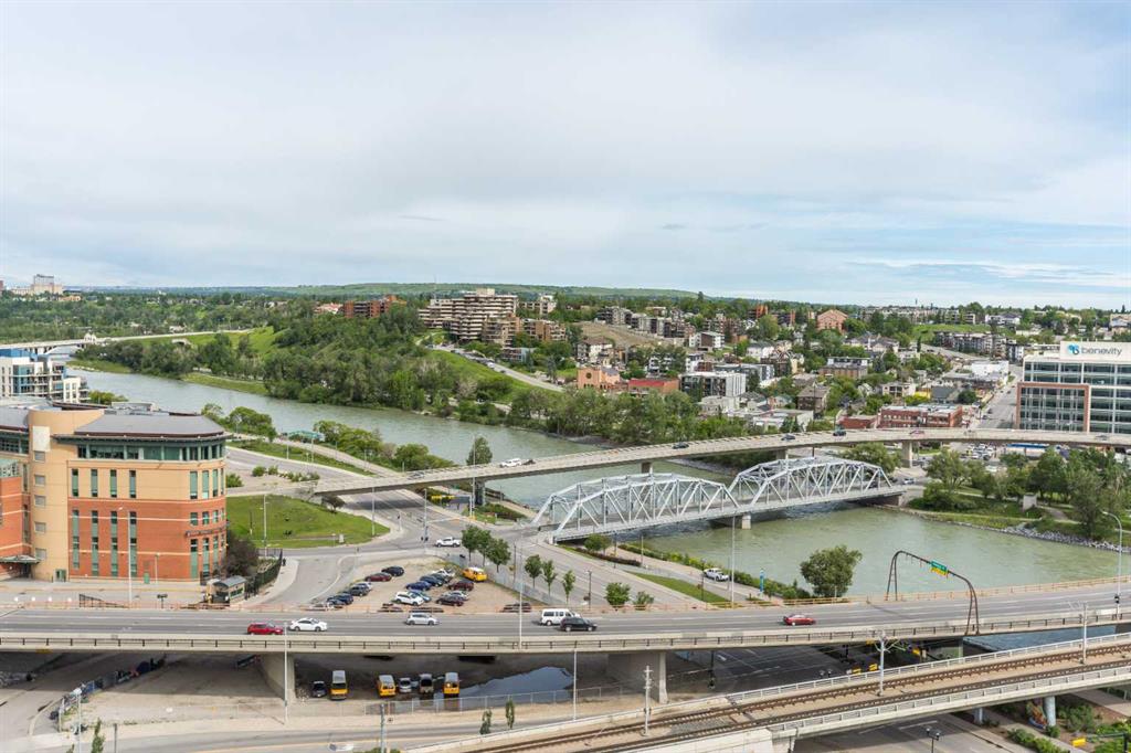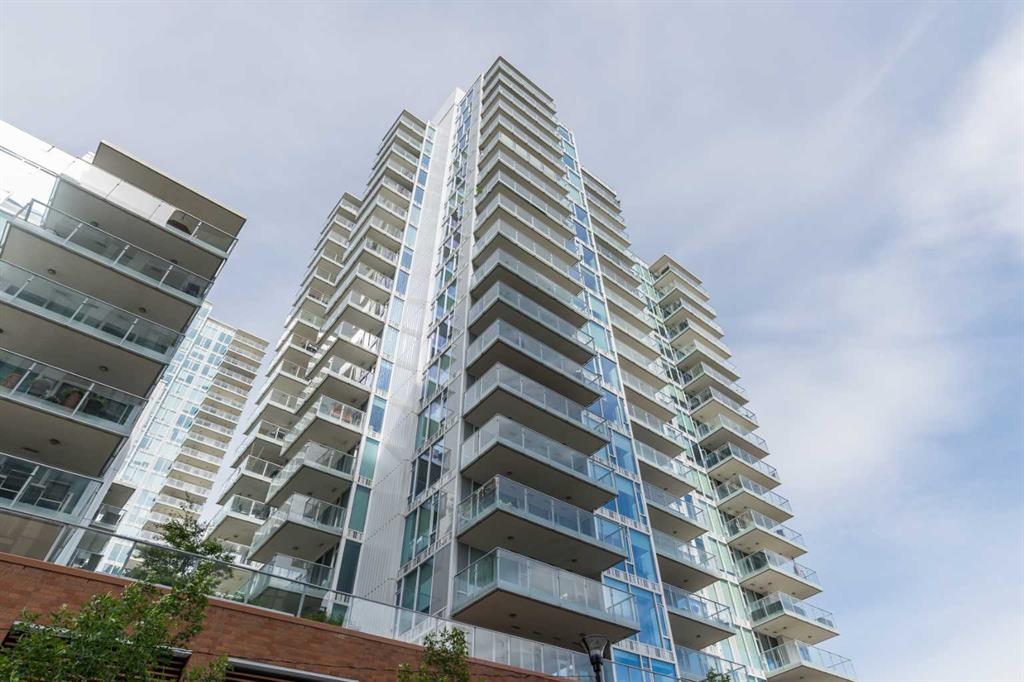 HOME SWEET HOME! Indulge in luxurious, trendy condo living with UNBEATABLE and UNOBSTRUCTED VIEWS of Bow River and St. Patrick Island in the popular Evolution building in sought-after East Village! This magnificently modern unit offers the ultimate in maintenance free living with 2 bedrooms, 2 bathrooms and 879+ SQFT of executive, stylish living space. Heading inside you will instantly fall in love with the sophisticated finishing’s including gleaming luxury laminate flooring, granite countertops, in-floor heating, floor to ceiling windows to bask in your spectacular river and city views and CENTRAL AC. The open concept layout features a sun-drenched living room with huge windows showcasing your dream views, a spacious dining area/breakfast nook and the gourmet chef’s kitchen complete with premium stainless steel appliances, a center granite island with an eating bar, granite countertops, granite backsplash and tons of cabinet space. Completing the inside of the unit is a laundry closet with storage space, a wonderful 3 piece bathroom, a generous sized bedroom, the stunning primary retreat with a walk through closet and a spa-like lavish 5 piece ensuite with dual vanity sinks, a private glass surround shower and a cozy tub. The huge covered balcony with a gas hookup for the BBQ offers you an outdoor oasis to enjoy hosting guests or having a drink while basking in your breathtaking river views. Additional features include an assigned, heated, secured, underground parking stall (situated directly beside elevator doors) and an assigned storage locker. You get exclusive access to amenities such as a fitness center with a sauna and a steam room, concierge, party room and an incredible rooftop patio/garden area. Pets allowed(Dog or 2cats). Steps from unrivaled amenities and Downtown Calgary hot spots, desirable restaurants, coffee shops, Bow River pathways, Central Library, Studio Bell, Fort Calgary, a shopping centre with a Superstore, major roadways and much more! Pet friendly with board approval. This condo is a MUST VIEW! Book your private viewing today!