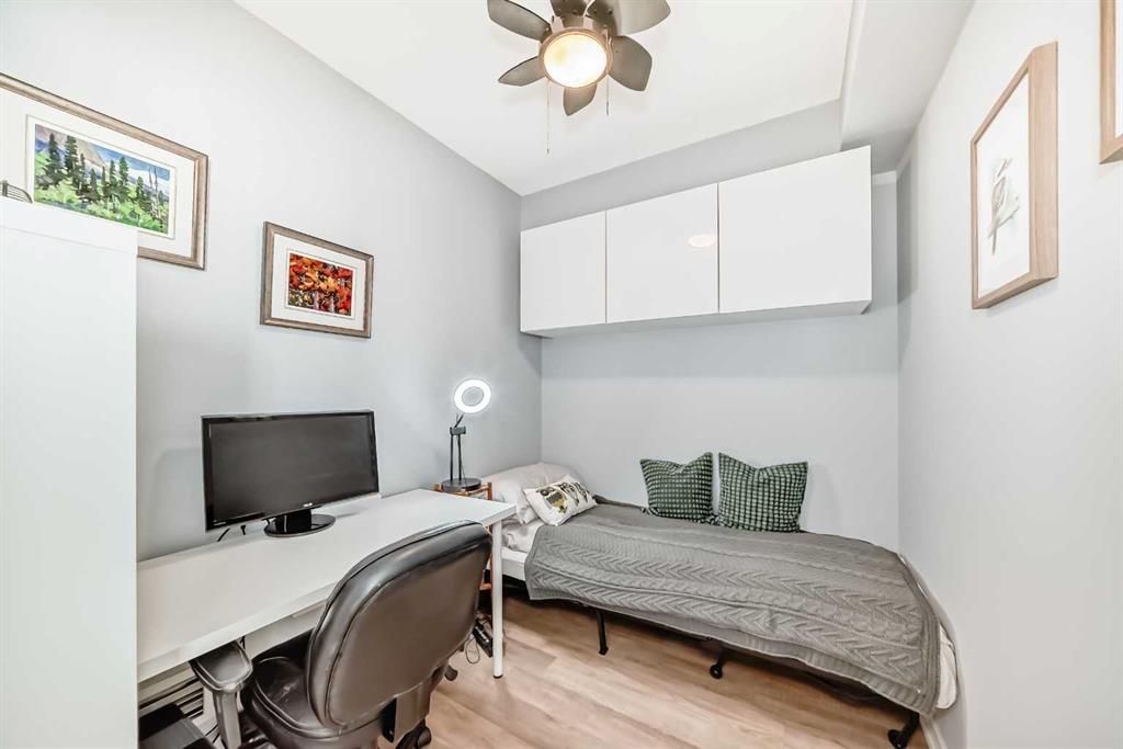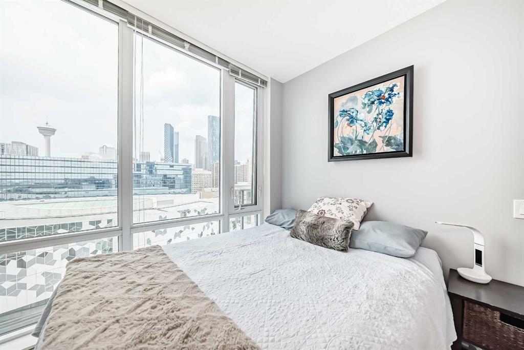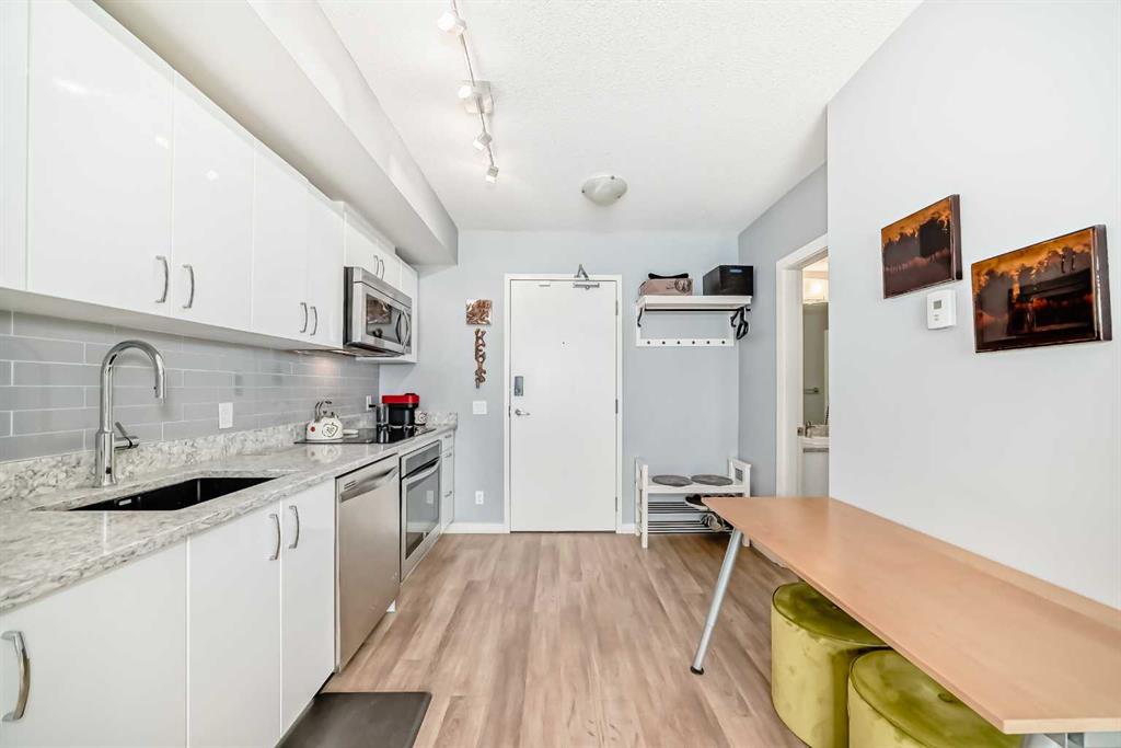 Welcome to an incredible opportunity in the heart of downtown on 8th Avenue SE. This prime location offers the convenience of being within walking distance to downtown shopping, restaurants, the river, Princess Island Park, and the extensive network of walking and biking paths. The C-train is also just a short stroll away, making commuting a breeze. Situated in a secure building, this modern and neutral two-bedroom, one-bath unit is located on the 15th floor and showcases vinyl plank flooring throughout. The open concept connects the living room, dining area, and kitchen, creating a bright and airy space that leads to a spacious deck with spectacular views. The kitchen is finished with high gloss white cabinets, granite countertops, and a built-in washer and dryer combination neatly tucked within the cabinetry. The master bedroom offers a custom closet and includes a wall-mounted TV, with ample space for a queen-sized bed. The second bedroom is versatile, featuring a pull-out bed and space for a desk, making it ideal as a guest room, office, or flex space. Residents can enjoy the building’s gym, rooftop patio, extra storage, and a large bike storage room in the basement. This property is perfect for those who work downtown, enjoy an active lifestyle, or are seeking a great investment opportunity. Don’t miss your chance to own in this unbeatable location.