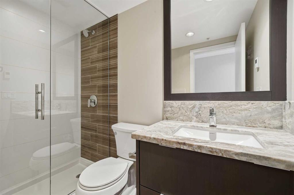 Welcome to Evolution, where city living meets incredible views and an unbeatable location. This bright and beautifully designed 2 bedroom plus den, 2 bathroom home offers nearly 900 sq ft of thoughtfully planned space with panoramic views of the Bow River and St. Patrick’s Island Park. The kitchen is both stylish and functional, featuring stainless steel appliances including a gas range, granite countertops, and plenty of cabinetry, all opening seamlessly into the dining and living areas, perfect for entertaining or everyday living. Floor to ceiling windows fill the home with natural light and lead out to an expansive balcony where you can soak in the city skyline. The bedrooms and bathrooms are tucked away for privacy while still enjoying the same stunning views and sunshine, and the den makes an ideal home office or flex space. In suite laundry, underground parking, and additional storage add everyday convenience. Residents of Evolution enjoy concierge service, visitor parking, two fitness rooms, steam and sauna rooms, and a beautiful elevated courtyard and lounge. Located in the heart of East Village, you are just steps to the Calgary Public Library, Studio Bell, the Simmons Building, river pathways, great dining, green spaces, and more, making this a fantastic opportunity to enjoy vibrant, walkable downtown living.