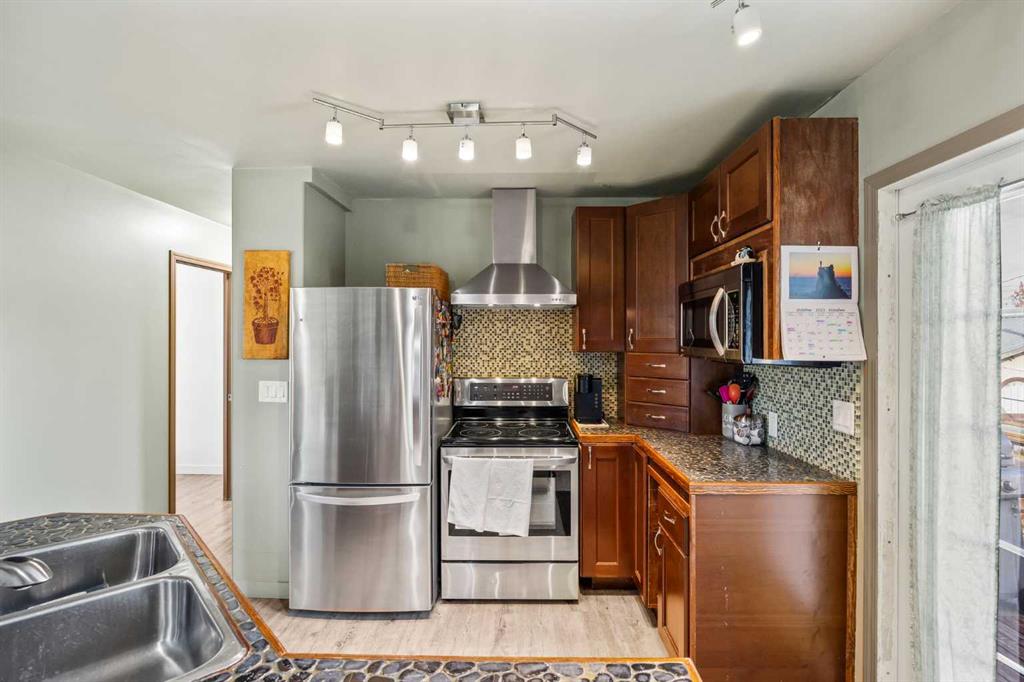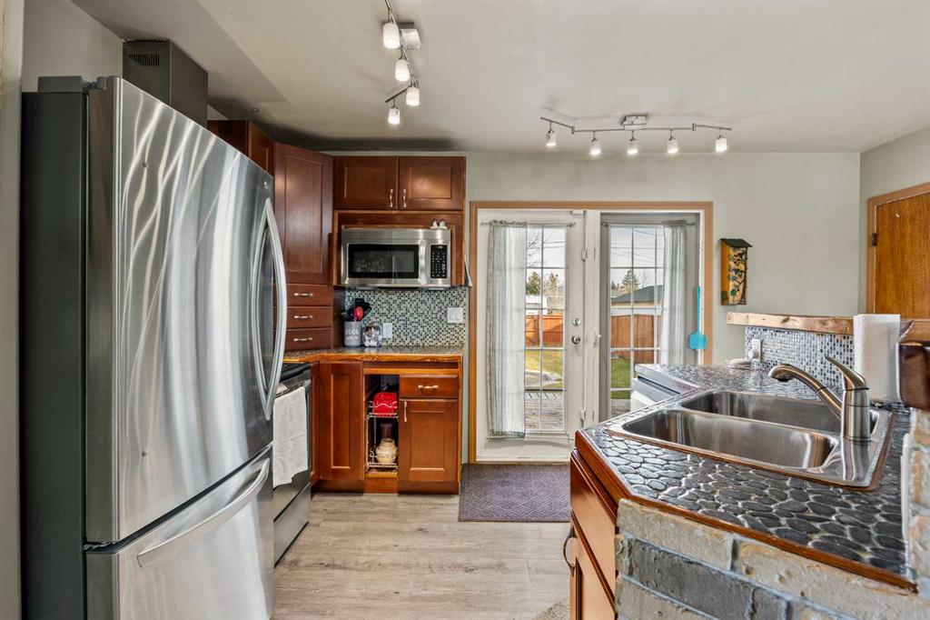 ?50′ X 127′ Lot with R-CG Zoning. Redevelop, rent or relocate to this convenient location just steps to schools, shopping, forest lawn athletic park, and 15 minutes to downtown Calgary. This charming bungalow has been lovingly cared for and updated throughout. The main floor offers an open concept floor plan with plank flooring throughout, an updated kitchen, stainless steel appliances (estimated 2017), island with eat up bar and electric fireplace with brick facing, a bright living room with a big bay window and the dining room has a built-in table with adjustable sizing. There are 3 bedrooms, making it easy for the whole family to be on one floor. The full bathroom has an updated vanity with ample counter space, subway tile and wood slat ceiling. The basement is partly finished with a 2nd full bathroom, laundry room, and side entry for easy access or future suite potential. There is a double detached garage and large yard. Windows, insulation and electrical were updated in 2017. Roof updated 2020. Book your showing today!