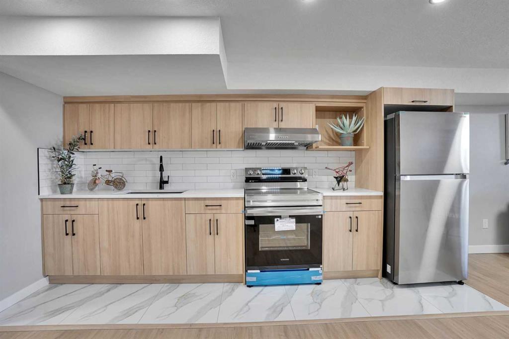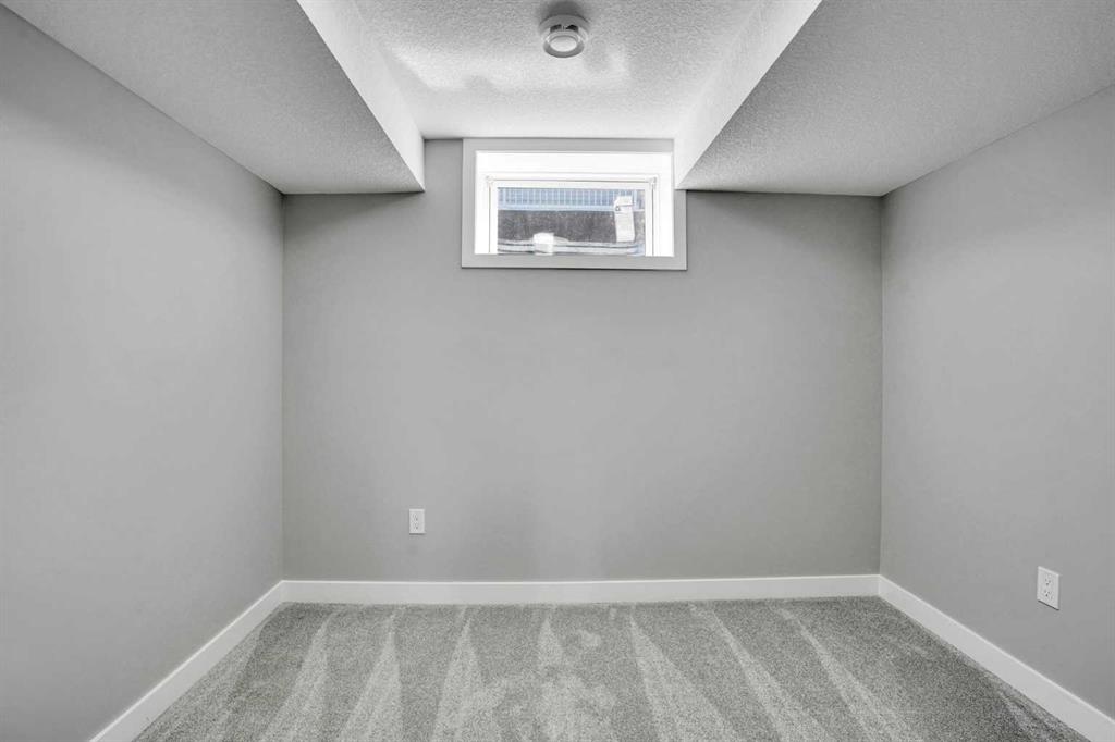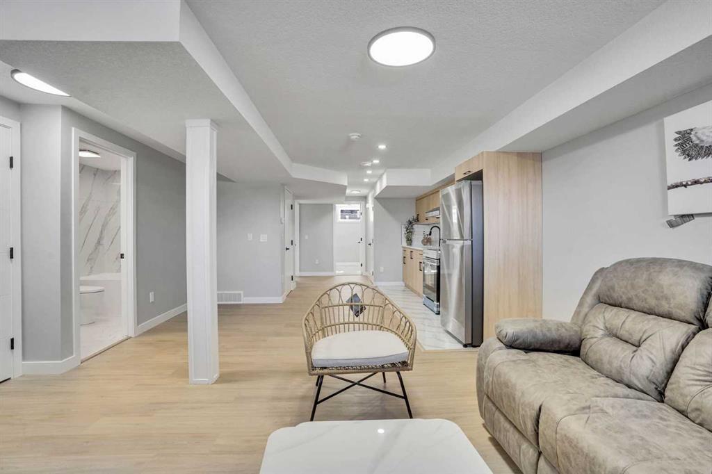 The fully finished basement legal suite features a separate entrance, two spacious bedrooms, a modern kitchen with stainless steel appliances, a 4-piece bathroom, and a large recreation/living area with large windows, offering excellent functionality and income potential.