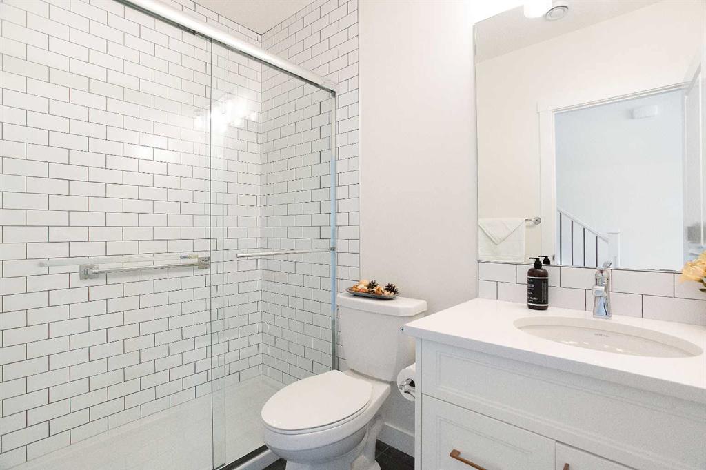 The fully developed basement is bright and inviting with 9.5-foot ceilings, oversized windows, and a large sliding glass door. It includes a generous recreation area, fourth bedroom, office, and a convenient full bathroom with a walk-in tile shower.