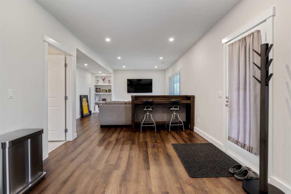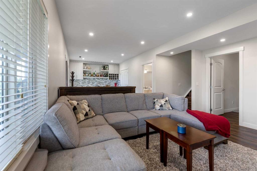 A fully developed 9ft ceiling walkout basement complete with a bar, recreation room, bedroom, and full bathroom.