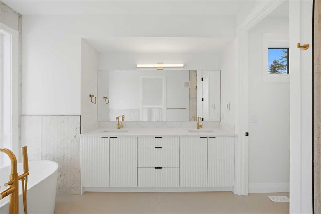 Upstairs, you’ll find three generously sized bedrooms, each thoughtfully designed to provide comfort and privacy. This level features three full bathrooms, a rare and highly desirable feature, along with a conveniently located laundry room for added ease. The primary bedroom serves as a luxurious retreat, complete with a vaulted ceiling that enhances the sense of space, a large walk-in closet, and a spa-inspired 5-piece ensuite featuring high-end finishes, dual vanities, a soaker tub, and a separate shower.