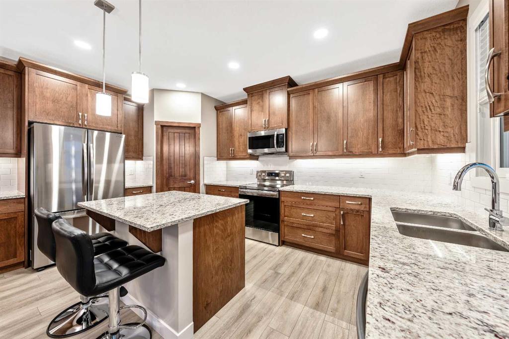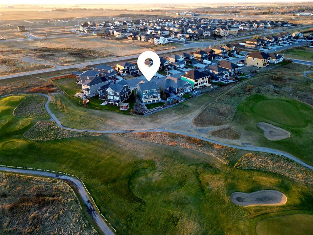 As you approach this inviting home in Boulder Creek Estates, you’ll immediately notice the care put into the landscaping with lush flower beds, mature trees, and pristine hardscape set off the property beautifully. The vantage point at the end of a quiet cul-de-sac affords sweeping views over the Track Golf Course, offering changing vistas through every season. Step through the front door and you are greeted by 9-foot ceilings and warm vinyl plank flooring flowing across the main level. To your right, a light-filled office or flex space awaits, perfectly suited to remote work, study, or quiet reading. Further in, the living and dining spaces open to reveal unobstructed views of the golf course through large windows. The kitchen is both elegant and practical, featuring a central island, granite countertops, stainless steel appliances, and a roomy walk-in pantry. The living room is cozy and welcoming, anchored by a graceful fireplace that promises comfort during cold Alberta winters. Sliding patio doors lead you to a generous, partially covered rear deck which is a prime spot to entertain or simply soak in the views.