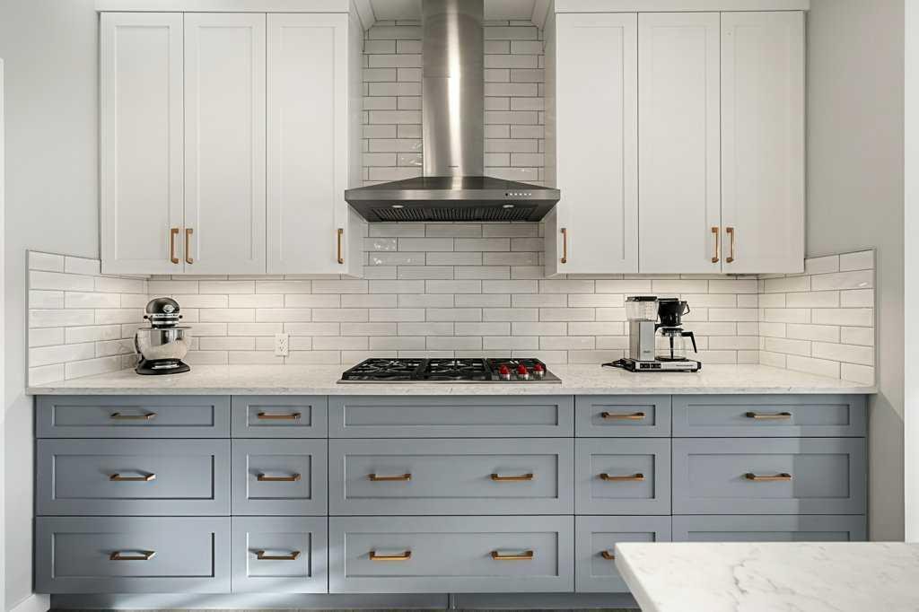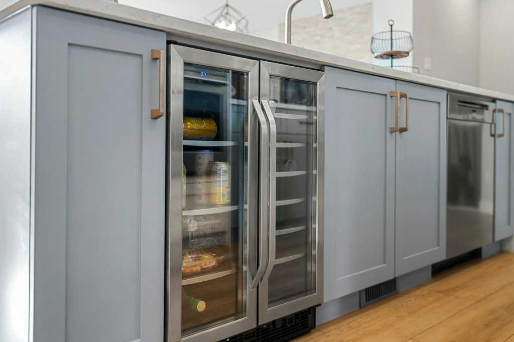 The main floor is thoughtfully designed with 9’ knockdown ceilings, LVP flooring, silhouette blinds, and a stunning floor-to-ceiling stone fireplace anchoring the living area. The chef’s kitchen is a showstopper with white perimeter cabinetry and a light grey waterfall island, quartz countertops, soft-close cabinetry with crown molding, dovetail drawers, gold accents, pot lighting, and a Silgranite sink. Premium appliances include a Wolf 5-burner gas cooktop, chimney hood fan, built-in Wolf speed oven and wall oven, Miele dishwasher, Samsung smart refrigerator, and bar fridge. A walk-through pantry with pocket doors connects to the mudroom and garage entry. The mudroom offers dual closets and access to a stylish 2-piece bath, while the large front foyer includes a guest closet and broom storage.