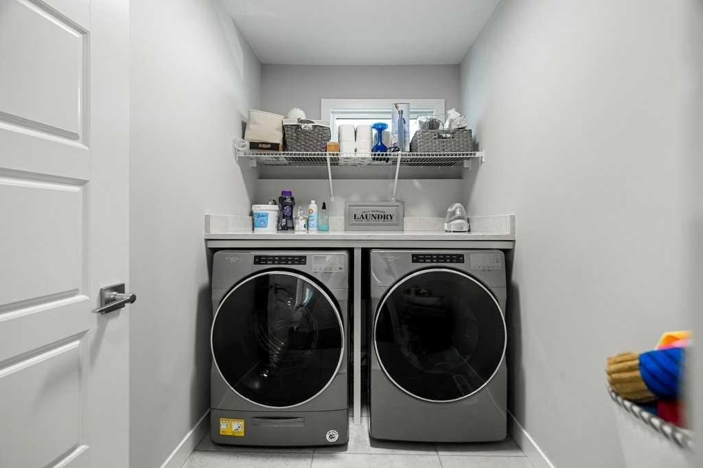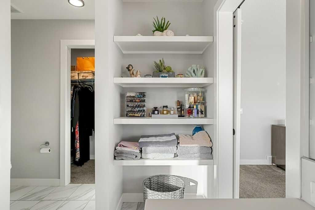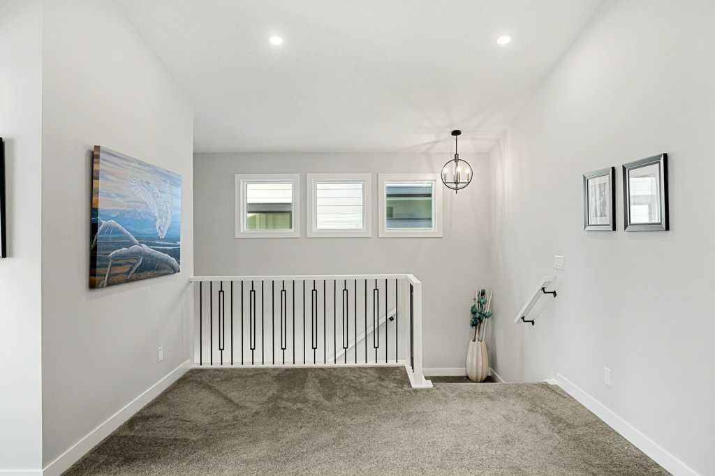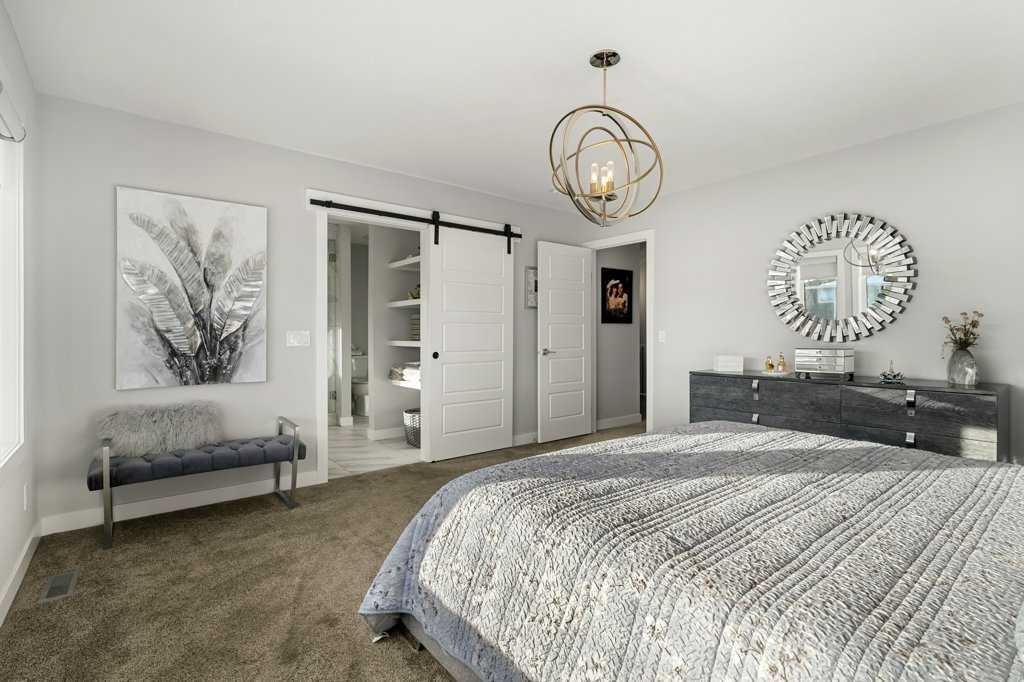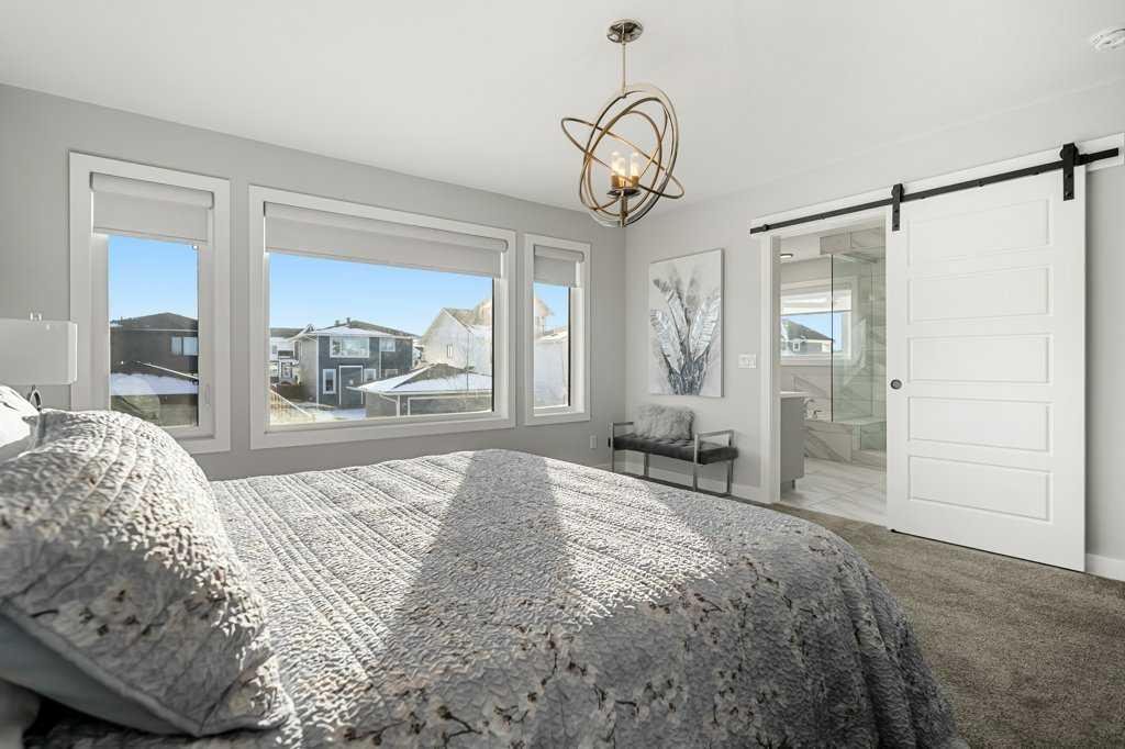 Upstairs features upgraded carpet with 10 lb underlay, an open rail staircase, and a central bonus room with vaulted ceiling and pot lights. The primary bedroom is positioned at the back of the home and includes a feature wall and barn door leading to a luxurious 5-piece ensuite with fully tiled shower (10 mm glass), soaker tub, tower cabinetry, and a walk-in closet with added shelving. Two front bedrooms share a beautifully finished 4-piece bath with quartz counters and tiled tub surround. Upper-floor laundry offers tile flooring, a window, and quartz folding counter. Three picture windows over the stairwell add abundant natural light.