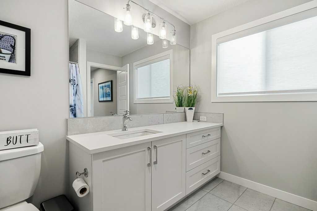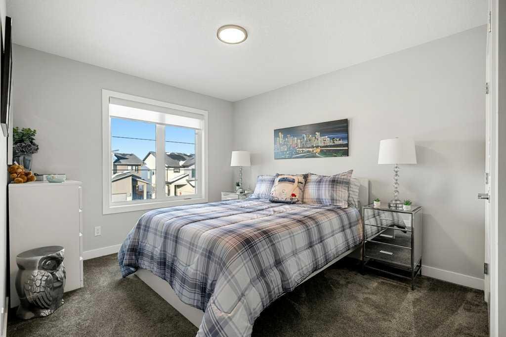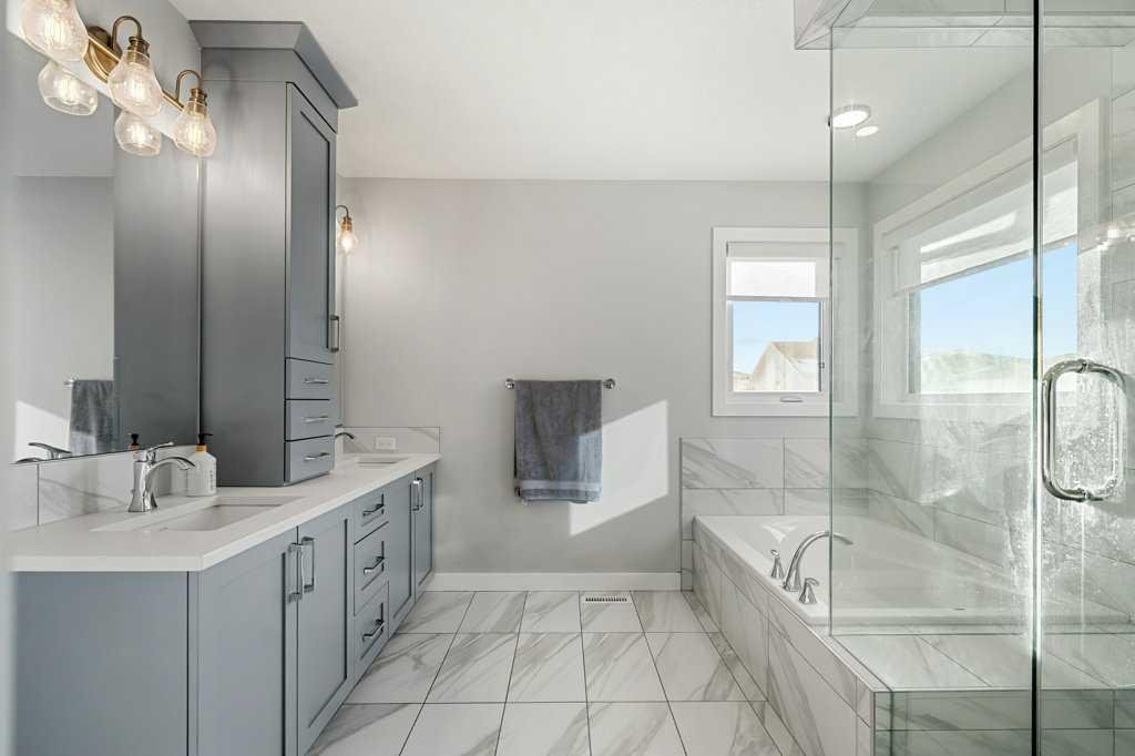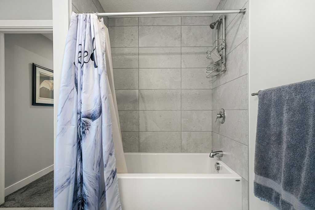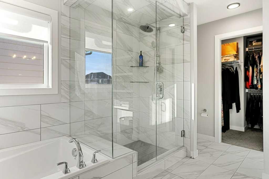 Upstairs features upgraded carpet with 10 lb underlay, an open rail staircase, and a central bonus room with vaulted ceiling and pot lights. The primary bedroom is positioned at the back of the home and includes a feature wall and barn door leading to a luxurious 5-piece ensuite with fully tiled shower (10 mm glass), soaker tub, tower cabinetry, and a walk-in closet with added shelving. Two front bedrooms share a beautifully finished 4-piece bath with quartz counters and tiled tub surround. Upper-floor laundry offers tile flooring, a window, and quartz folding counter. Three picture windows over the stairwell add abundant natural light.