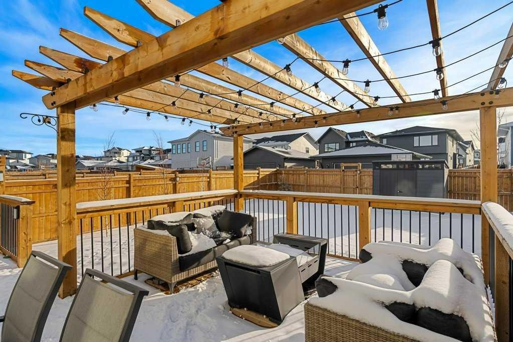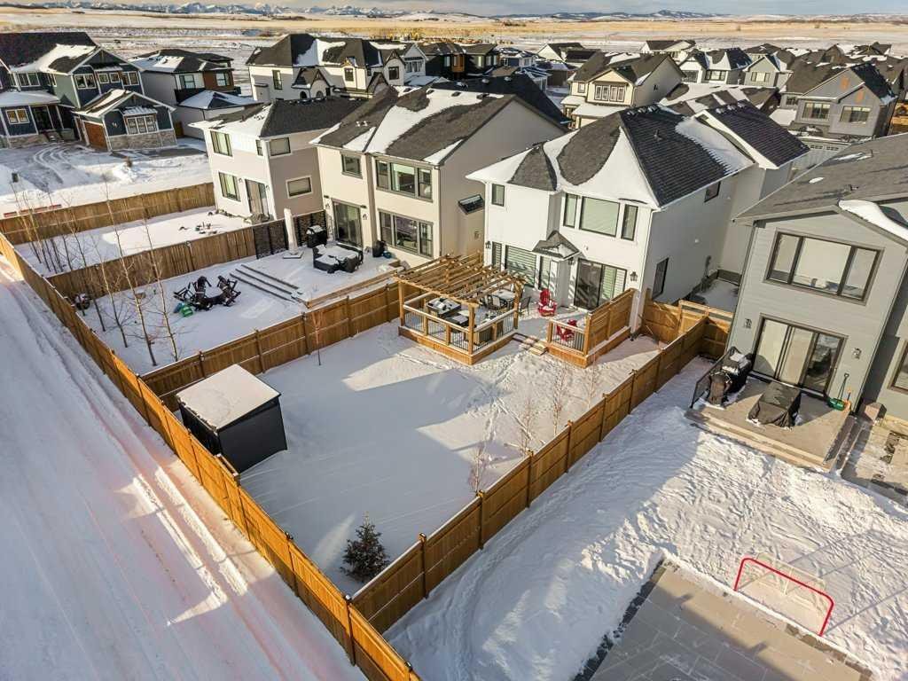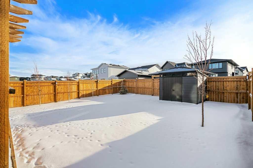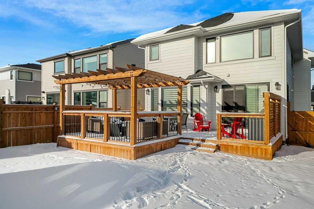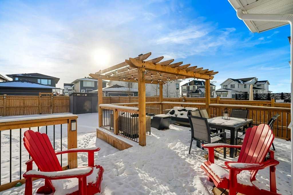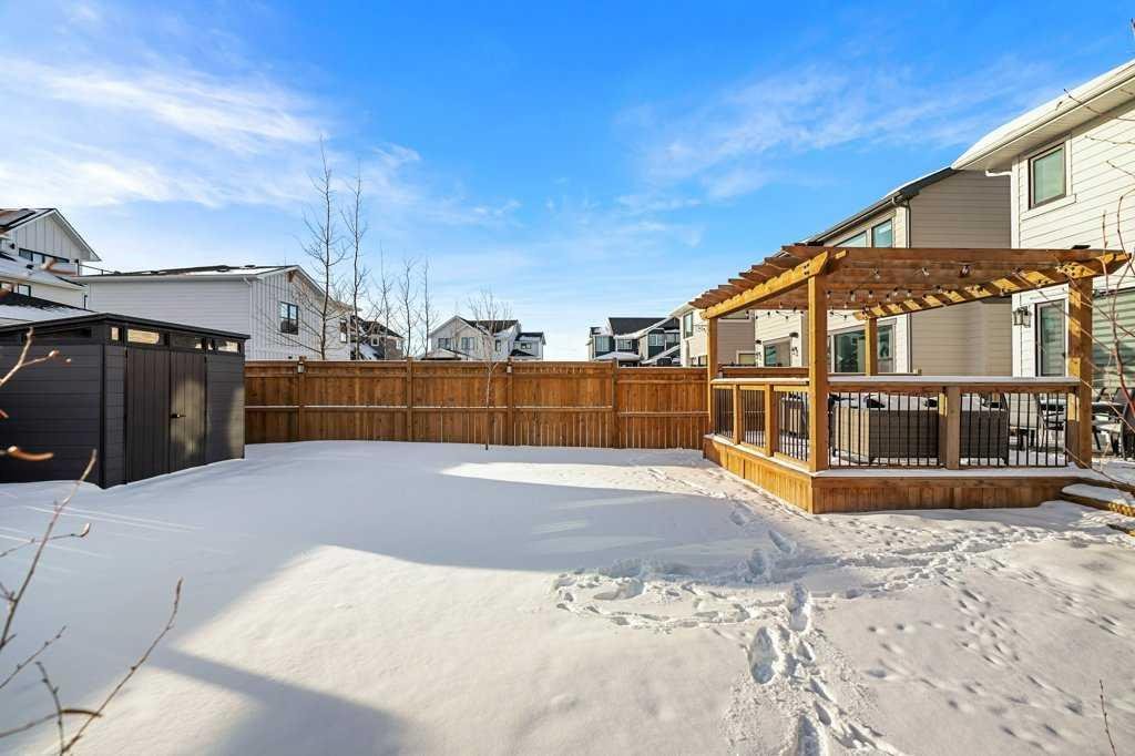 Exceptional Sterling Homes built Allure 3 plan featuring a south-facing backyard and extensive upgrades throughout. The exterior showcases durable Hardie board and stone, with an attached double garage and paved back lane. The oversized, fully fenced yard (approximately 139–135 feet deep) includes a large deck, privacy-side pergola, storage shed, BBQ gas line, and expansive sliding doors that seamlessly connect indoor and outdoor living.