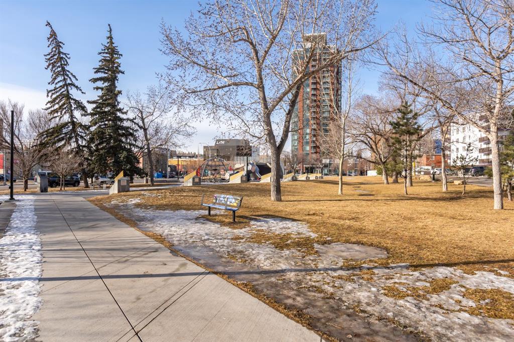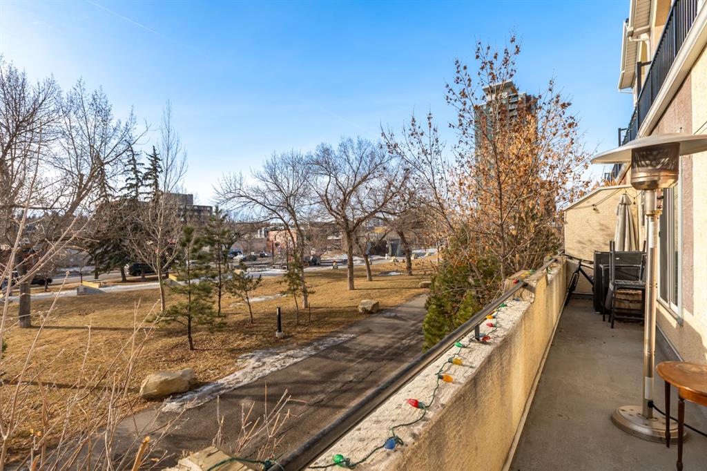 Welcome to urban living at its finest in the heart of Calgary’s Beltline. Tucked behind a secure, landscaped courtyard and backing directly onto a park, this beautifully updated 2-bedroom, 2-bath bungalow-style townhome offers privacy, comfort, and exceptional walkability. Inside, the bright open-concept layout is drenched in natural light and features hardwood flooring, 9’ ceilings, and a cozy gas fireplace—ideal for everyday living and entertaining. The kitchen has been refreshed with quartz countertops, a new sink and faucet, painted cabinetry (2023), a new stove (2024), and a brand-new refrigerator (2025). The spacious primary bedroom includes a private ensuite, while the second bedroom—perfect as a guest room, home office, or den—offers its own separate entrance. In-suite laundry, in-floor heating, and a single-level floor plan add everyday ease. Step outside to the south-facing 36’ patio, where the home is bathed in sunshine throughout the day, with park views, blooming lilacs in the spring, and beautiful sunsets in the evening. Just steps from 17th Avenue SW, with cafés, restaurants, and shops at your doorstep, this home blends inner-city energy with green-space tranquility. Assigned covered, tandem parking for two, pet-friendly living (with restrictions), and a well-managed complex complete this Beltline gem.