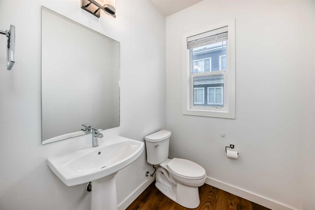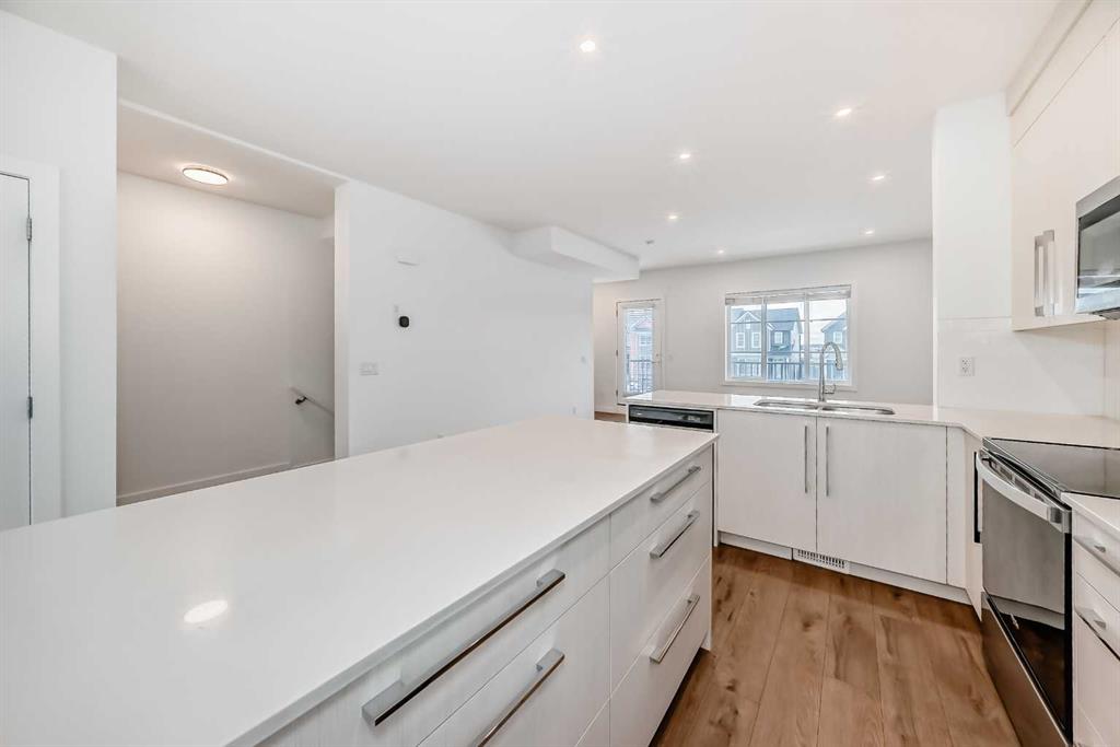 The bright and open concept second level is filled with natural light from large windows. The spacious living room offers direct access to a generous balcony, perfect for relaxing or entertaining. The contemporary kitchen is equipped with quartz countertops, stainless steel appliances, a large island, soft close cabinetry, and a pantry for added storage. Adjacent to the kitchen is a dedicated dining area, ideal for everyday meals and gatherings. A convenient two piece powder room with a large window completes this level.