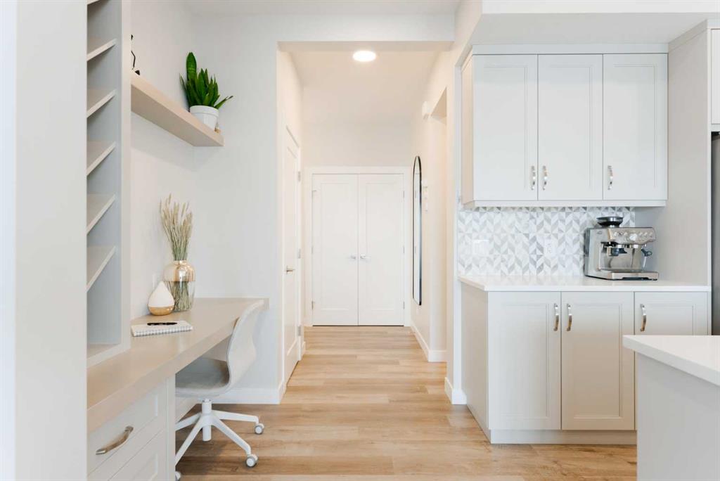 Inside, the palette is light and neutral with a nod to coastal — clean, bright, airy, calm, and timeless. The open-concept main floor features 9’ ceilings, luxury vinyl plank flooring, expansive windows, and a gas fireplace. The kitchen is a true centerpiece, anchored by a large island with seating—perfect for entertaining, homework, or everyday meals. Crisp shaker cabinetry, white quartz counters, a full-height designer tile backsplash, and a built-in wall oven/microwave create a finished look that feels custom.