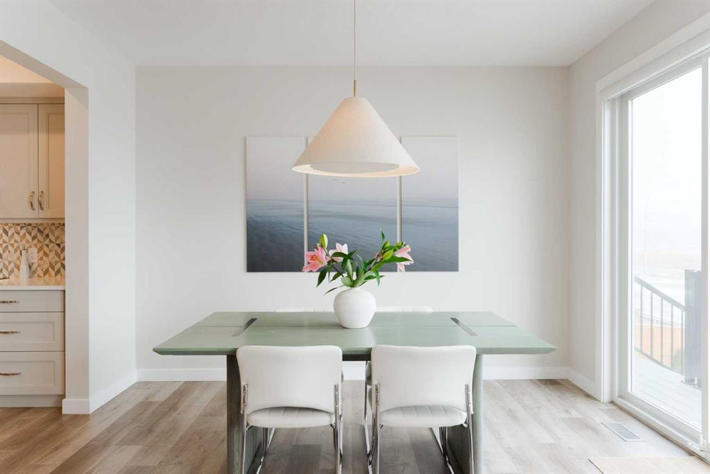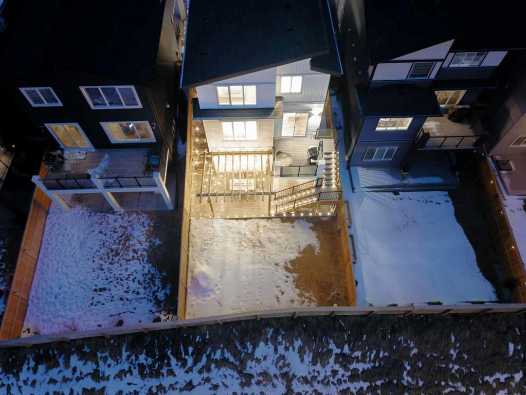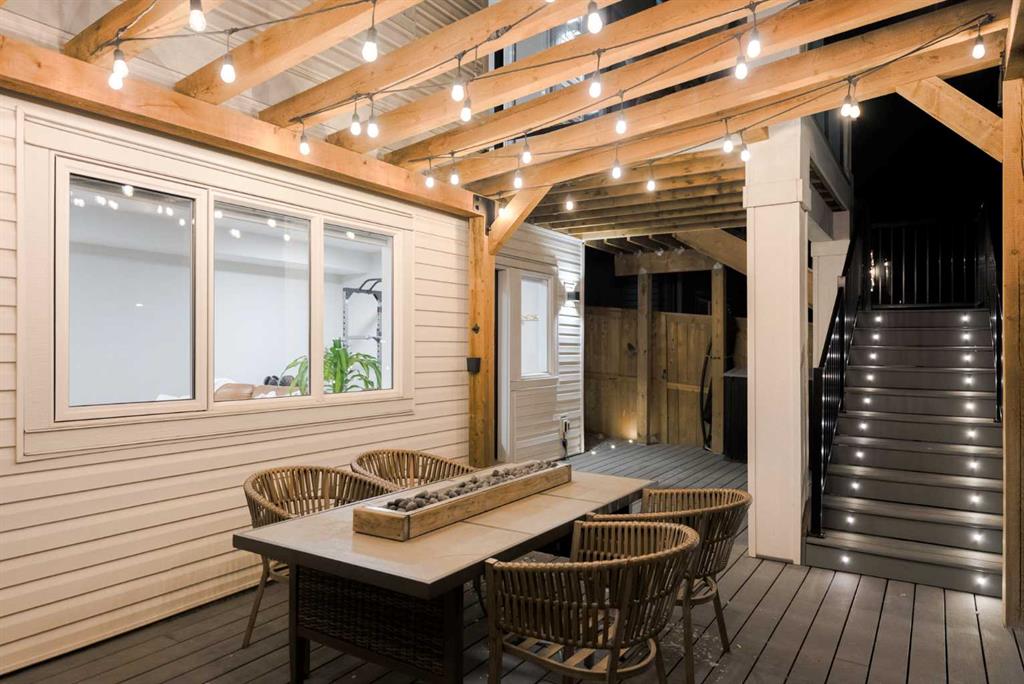 The show-stopper backyard was designed for real outdoor living: a composite deck system with integrated lighting, modern pergola, turfed dog run, wraparound four foot wide stairs, and dedicated gas lines for both BBQ and fire feature—built for hosting and taking in the view. In the distance, watch the train wind through the valley as sunlight sparkles off the Bow River.