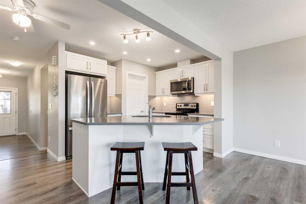 Welcome to 157 Hillcrest Square SW – a bright and modern 3-bedroom, 3.5-bathroom townhome featuring a fully finished walk-out basement, a private fenced southwest-facing backyard, and best of all, no condo fees! With nearly 2,000 sq. ft. of developed living space and a single attached garage, this property offers incredible value for first-time buyers, families, or downsizers looking for comfort and convenience in a fantastic neighbourhood. From the moment you step inside, you’ll appreciate the thoughtful design and open layout. The kitchen is stylish and functional with stainless steel appliances, quartz countertops, a central island with stool seating, and a generous walk-in pantry. The adjoining dining and living rooms are flooded with natural light and provide direct access to a sunny balcony – a perfect spot for BBQs or an evening glass of wine. A tucked-away 2-piece bathroom completes the main floor. Upstairs, you’ll find three spacious bedrooms. The primary suite features a large walk-in closet and a spa-like ensuite with walk-in shower and oversized vanity offering excellent storage. Bedrooms two and three are bright, well-proportioned, and share a 4-piece bathroom with yet another large vanity and plenty of storage. Convenient upstairs laundry completes this level, adding to the home’s smart functionality. The walk-out basement expands your living space with a large and sunny recreation room – perfect for family movie nights, kids’ play space, or game-day gatherings. Sliding glass doors open directly onto your private backyard, which is fenced and offers gated access to a walking path and natural green space. A 3-piece bathroom, mechanical room, and an impressive 150 sq. ft. storage room complete this level. Located in the sought-after Hillcrest community, this home offers unbeatable convenience. Parks, schools, shopping, and green spaces are just steps away, while quick access to major commuter routes makes getting around easy. With its spacious layout, modern finishes, walk-out basement, and no condo fees, this is the opportunity you’ve been waiting for!