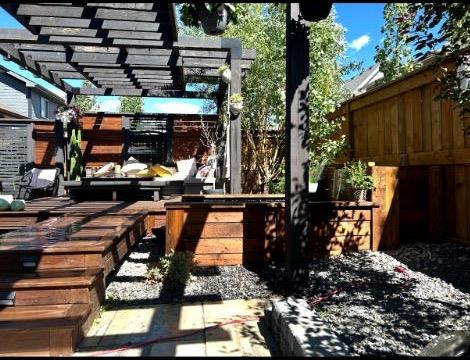 The oversized double attached garage is truly a standout feature, measuring approximately 20’ x 23’ with an impressive 15’ ceiling height. Professionally finished, this space has been extensively customized with an epoxy-coated floor, hot and cold water with additional shut-off valves conveniently located in the basement, and frost-free taps in the garage for added peace of mind. Heating is provided by a Schwank 40,000 BTU radiant tube heater with thermostat ($10k value), complete with a permitted fresh air intake. A dedicated 220V outlet on its own breaker has also been installed, offering excellent flexibility for future use. Tire hangers mounted beside the wall-mounted black cabinet are included. The backyard has been thoughtfully designed to create a private and inviting outdoor retreat, framed by mature trees for natural privacy. A custom cedar deck anchors the space, complemented by a covered pergola featuring substantial Douglas fir beams and a solid fir structure. Carefully planned landscaping and a structured drainage system enhance both the beauty and long-term functionality of the yard and a structured drainage system designed to prevent water issues. Additional features include reflective tint on all windows to help keep the home cool in summer months, and a transferable business permits. Riviera is the upscale community you will love to call home, just steps from the gorgeous Bow River and a short drive to Calgary and the Rocky Mountains.