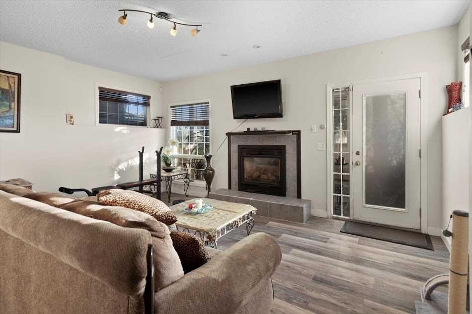The walkout level is designed for entertaining, featuring a kitchen area, a living room with a fireplace, a sunroom, an additional bedroom with a 3-piece bathroom, and a playroom.