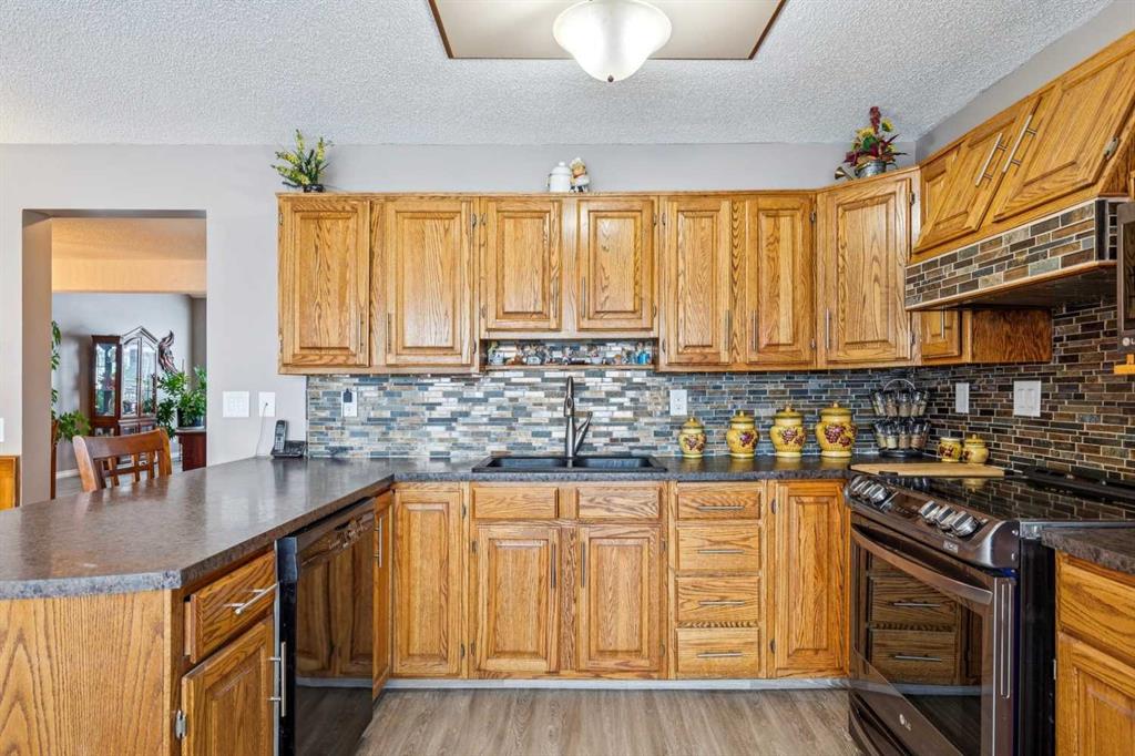 Welcome to this beautifully maintained & loved (only the 2nd owners!) 2-storey home backing directly onto greenspace in the desirable community of Beddington Heights, offering over 2,600 sqft of fully developed living space and an exceptional combination of privacy, comfort, and family-friendly living. Enjoy your morning coffee on the charming front porch (cedar). The bright and welcoming main floor showcases a spacious front entrance with new exterior door 2 years ago, new luxury vinyl plank flooring (1 year old), vaulted ceilings with skylights, updated luxury vinyl plank flooring, a spacious living room with a bay window, and a formal dining area that flows seamlessly into the heart of the home. The well-appointed kitchen features an abundance of cabinetry, beautiful black stanless steel appliances (fridge and stove 3 years old), black double sink, beautfiul hood fan, island seating, and a sunny eating nook set within a bay window overlooking the beautifully landscaped backyard, while the adjacent family room is anchored by a charming brick wood-burning fireplace, creating the perfect space for everyday living and cozy evenings. Completing the main level are a convenient 2-piece bathroom (updated 2 years ago), main-floor laundry, and direct access to the double attached garage, which is insulated, drywalled, and heated (overhead door is approximately 2 years old). Upstairs, you will find 3 generously sized bedrooms and 2 full bathrooms, including a spacious primary retreat with walk-in closet and a large ensuite complete with a separate shower and relaxing soaker tub, all enjoying tranquil views of the greenspace behind. The fully developed basement is an entertainer’s dream, offering a large recreation room with custom western-style window shutters, a western-inspired wet bar with sink, and a pool table with accessories included, creating a true pub-style atmosphere ideal for hosting family and friends, along with a bathroom rough-in, cold room, and plenty of storage. Step outside to the fully fenced backyard, beautifully landscaped and featuring a lovely crabapple tree, a two-tiered deck ideal for summer BBQs and outdoor dining, lots of bird activity, and a rear gate in the back fence providing direct access to the greenspace behind the home. Ideally located in Beddington Heights, this home is surrounded by excellent amenities including nearby schools, playgrounds, walking paths, and shopping, with many parks within walking distance, easy access to Deerfoot Trail and Stoney Trail, and close proximity to public transit, recreation facilities, and everyday conveniences. This is a rare opportunity to enjoy a spacious family home in a well-established Calgary neighbourhood while backing directly onto greenspace, offering privacy, lifestyle, and long-term value. Furnace and shingles are from 2011.