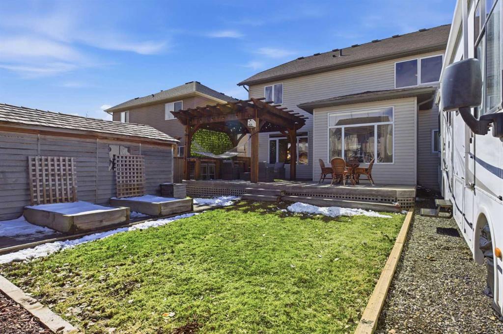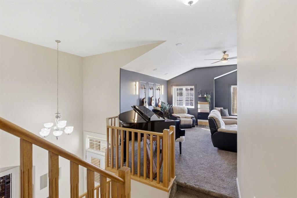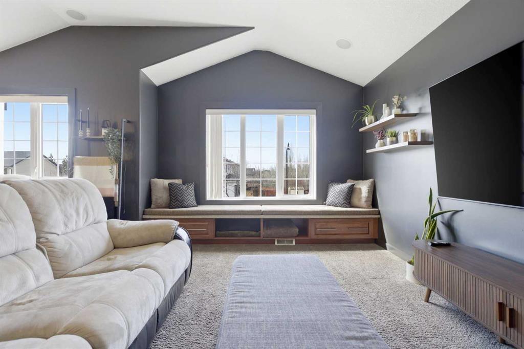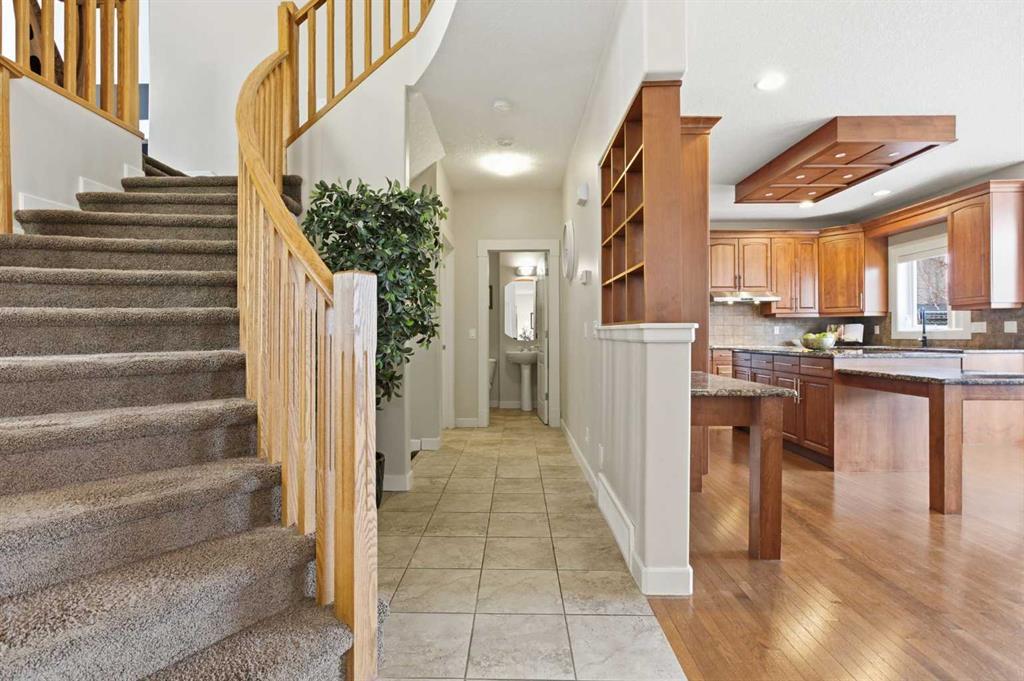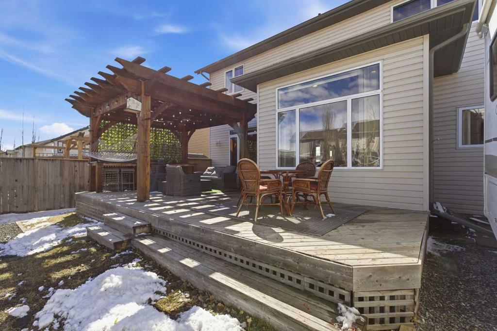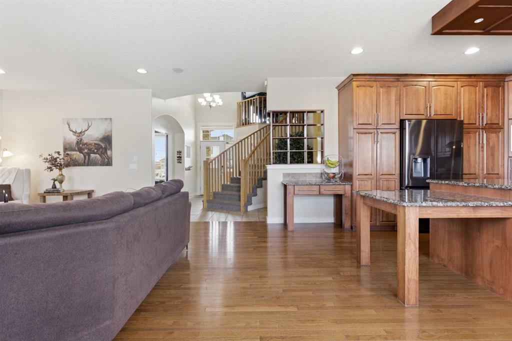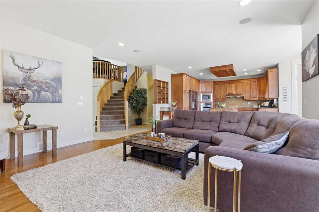 Welcome to this stunning 2490 above grade sq. ft. Landmark-built family home located in the sought-after community of Drake Landing. From the moment you step inside, you’re greeted by a dramatic foyer with soaring 18-foot vaulted ceilings, complemented by rich Sierra Oak hardwood and elegant ceramic tile flooring. The heart of the home is the gourmet kitchen, designed to impress with granite countertops, a massive island with eating bar, and full-height alder cabinetry offering exceptional storage. Outfitted with top-of-the-line appliances—including a convection wall oven, cooktop, and dishwasher—this space is perfect for both everyday living and entertaining. The inviting great room features a cozy gas fireplace and built-in CAT5 theatre sound, creating the perfect atmosphere for relaxing nights in. A versatile front flex room offers the ideal space for a home office or sitting area, while the spacious mudroom/laundry area and convenient 2-piece bath complete the main floor. Up the elegant spiral staircase, you’ll find a massive bonus/media room with vaulted ceilings and integrated CAT5 theatre sound—perfect for movie nights or family gatherings. The primary retreat is generously sized, featuring a walk-in closet and a luxurious 5-piece newly renovated ensuite with dual sinks, infloor heat, oversized glass/tile shower, and additional vanity storage. Two additional bedrooms, each with large closets, and a well-appointed 5-piece main bathroom provide plenty of space for a growing family. Additional highlights include dual-zone furnaces, central air conditioning, a brand new oversized 50 gallon hot water tank for ultimate comfort and efficiency, water softener, built in surround sound, master bath push button shower, heated insulated garage, RV parking pad, new fridge, huge pergola, and the list goes on! Step outside to enjoy the beautifully landscaped yard, complete with a massive deck and gas line hookup—ideal for summer BBQs and outdoor entertaining. Call your favourite realtor for a showing today!